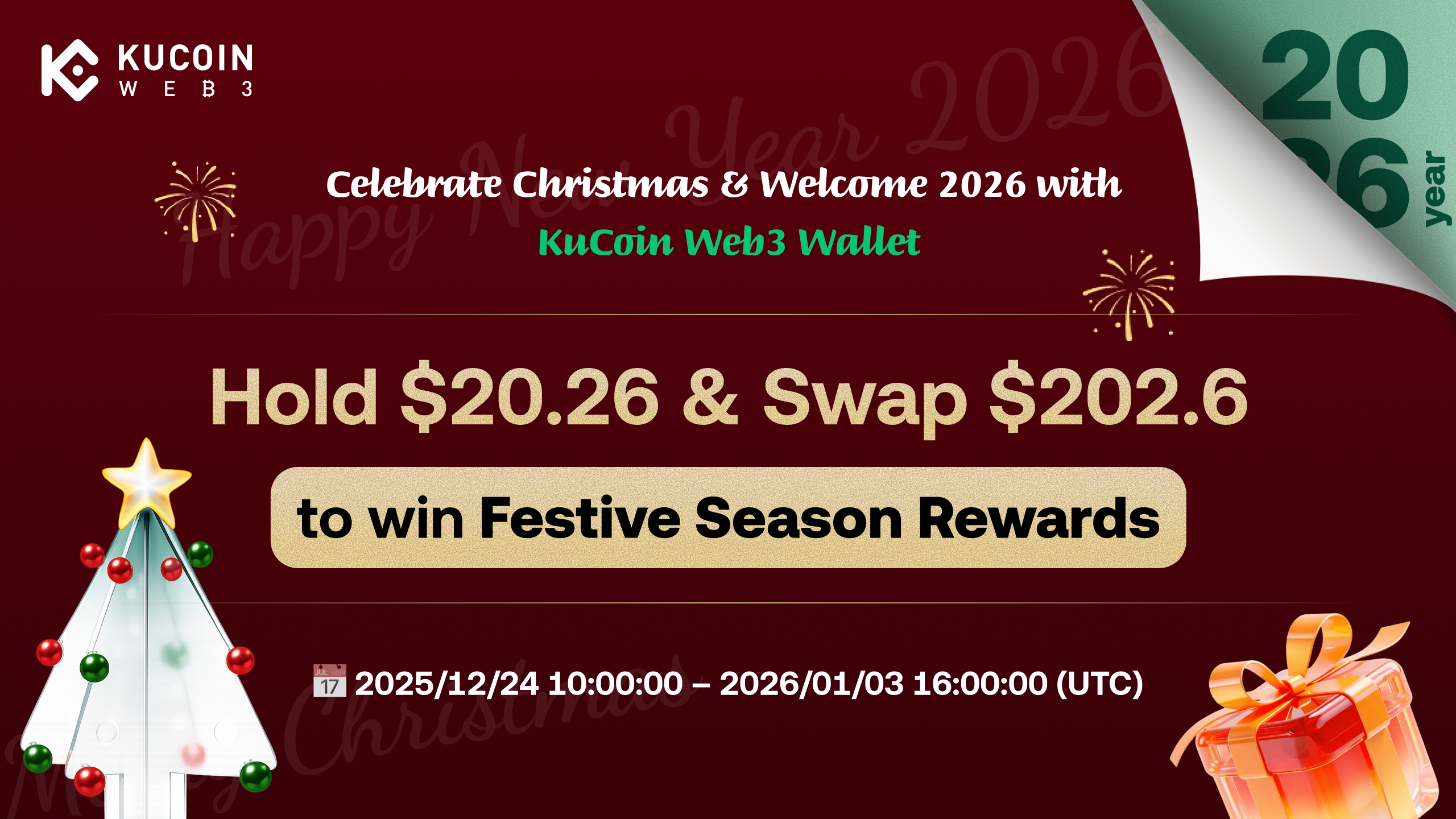 - Swap Task (Holiday Special): Complete swaps totaling ≥ 202.6 USDT using KuCoin Web3 Wallet during campaign;