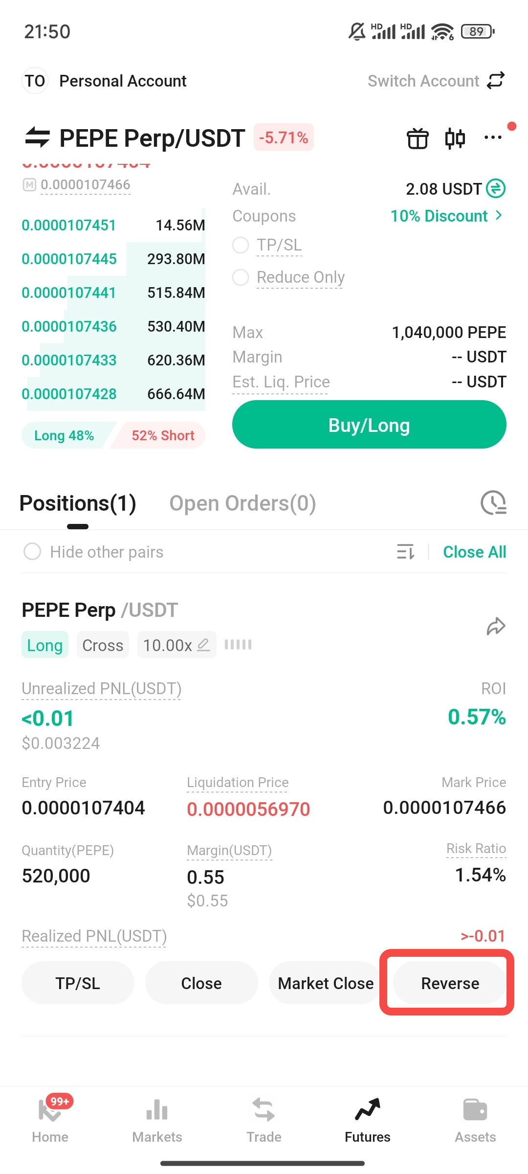 一鍵反手功能可讓您在市場行情反轉時,快速平掉當前持倉並立即以市價開立相同數量、相反方向的新部位。