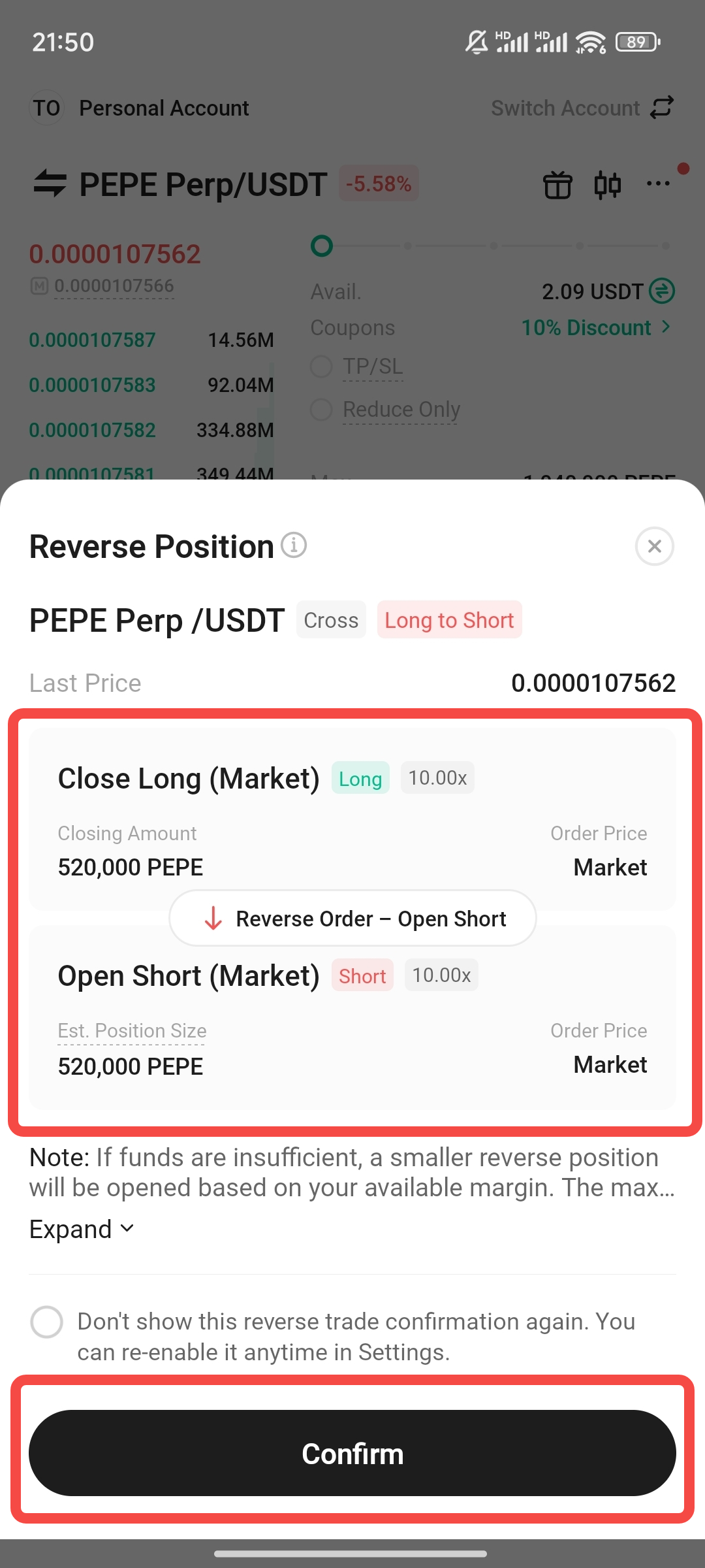 4. 確認無誤後,點選【Confirm】(確認)即可立即完成平倉。