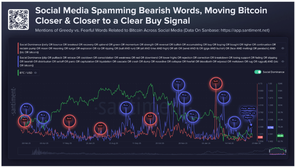 حتى أواخر مارس 2026، تُظهر مخططات Santiment أن لغة الخوف تشهد تزايدًا مرة أخرى، مع تحديد المؤشر للحظة الحالية كمنطقة مماثلة لإشارات "الشراء" السابقة التي تم تحديدها على مدار الأشهر الـ13 الماضية.