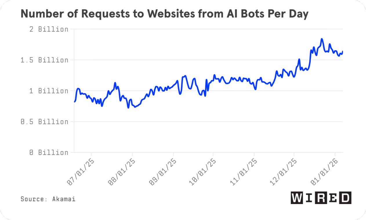 من 2024 إلى 2025، ارتفع حركة مرور ويكيبيديا بنسبة 50% بسبب الروبوتات، مما أدى إلى ضغط هائل على الخوادم وارتفاع تكاليف التشغيل. على الأقل 65% من الطلبات عالية الاستهلاك تأتي من الروبوتات. في فبراير 2025، تعرض موقع الصور DiscoverLife لهجوم يومي بملايين الطلبات من الروبوتات، مما أدى إلى شبه تعطل الموقع. وفي أغسطس، أبلغ مزود السحابة Fastly أن روبوتات كانت تطلب من موقع معين بمعدل 39,000 طلب في الدقيقة. كما تعرض دليل المجلات المفتوحة الوصول DOAJ لحالة مشابهة، ووصف موجة الروبوتات هذه بأنها "تعادل هجومًا رفضيًا وظيفيًا". وفي أحد أيام نوفمبر، ارتفع حجم حركة المرور بنسبة 968% مقارنة بالفترة نفسها من العام السابق.