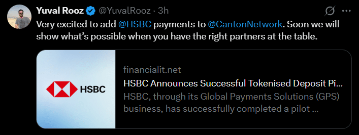 في هذا السياق، يبدو برنامج HSBC التجريبي على Canton أقل كتجربة "مستقلة" وأكثر كجزء من تحول مؤسسي أوسع نحو بنى تحتية مالية مدعومة بسلسلة الكتل.