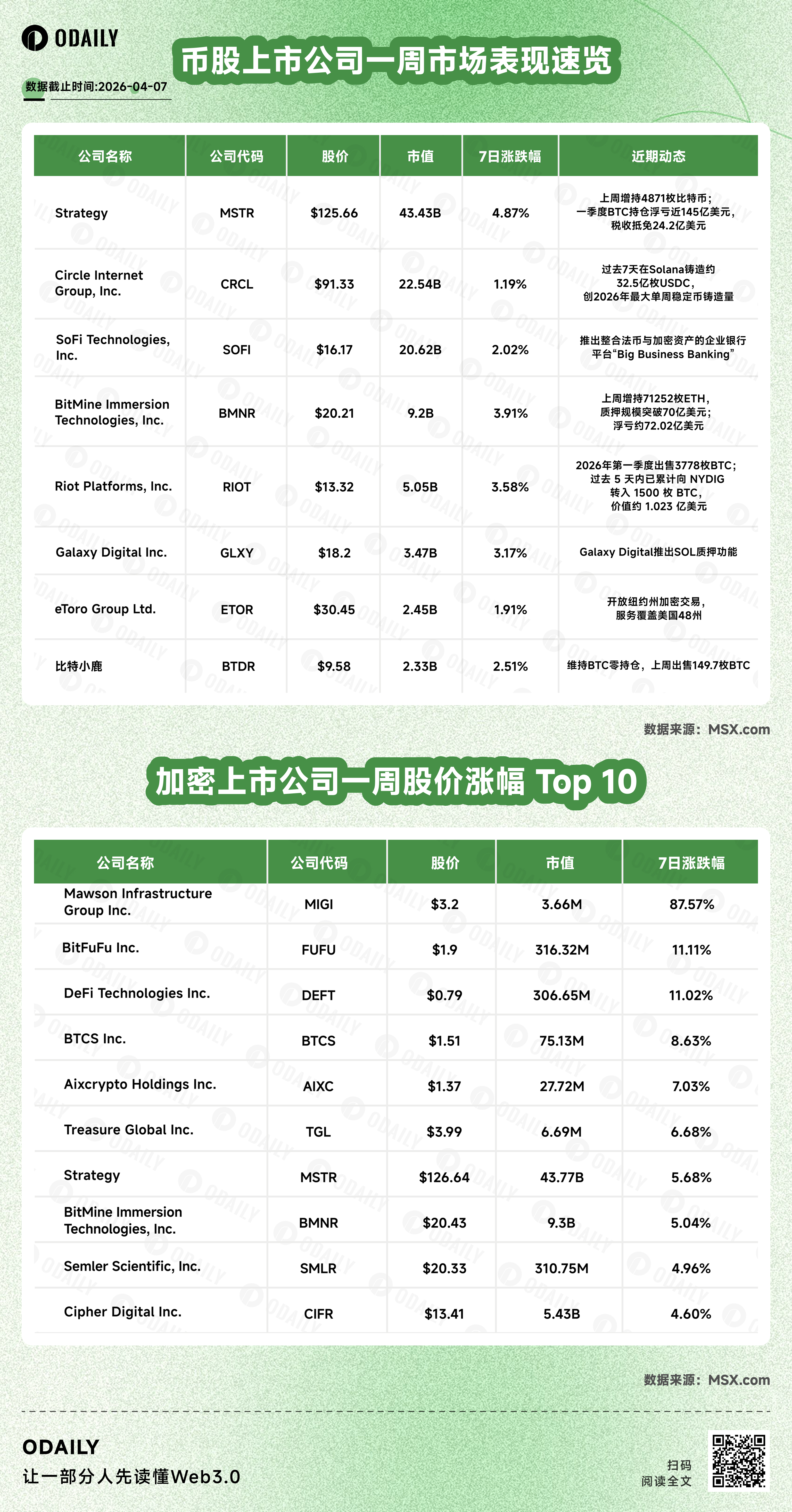 فيما يلي ملخص وتنظيم من Odaily Star Daily للمعلومات السوقية للعملات والأسهم الأسبوعية، وكل بيانات الأسهم الأمريكية مأخوذة من msx.com.