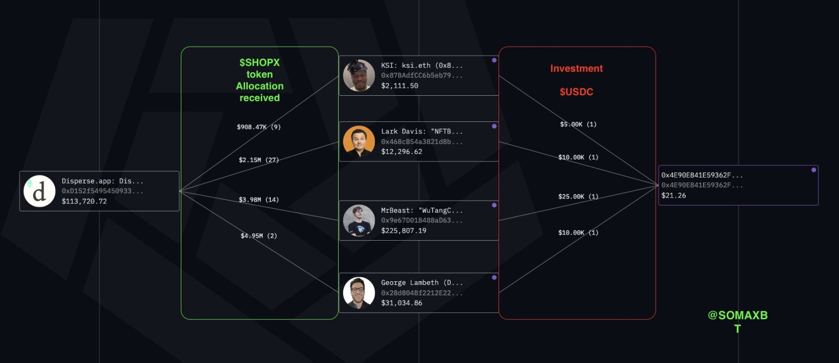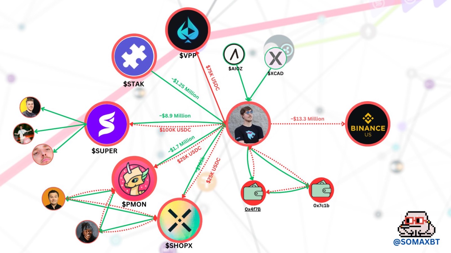 أفاد SomaXBT أن MrBeast استثمر 100000 دولار في المشروع وحصل على 1000000 من عملات SUPER كرد. بعد استثماره، ارتفع سعر العملة بشكل كبير، وفي 30 مارس 2021 نقل MrBeast عملات SUPER الخاصة به إلى محفظة احتياطية، حيث تم بيع هذه العملة عبر سلسلة من الصفقات، بإجمالي 1900 ETH (ما يعادل حوالي 3.7 مليون دولار في ذلك الوقت). حصل MrBeast على عملات SUPER إضافية وفقًا لعقد تخصيص، ثم باعها بسعر 5.5 مليون دولار، مما جعل إجمالي دخله من المشروع يصل إلى حوالي 9 ملايين دولار.