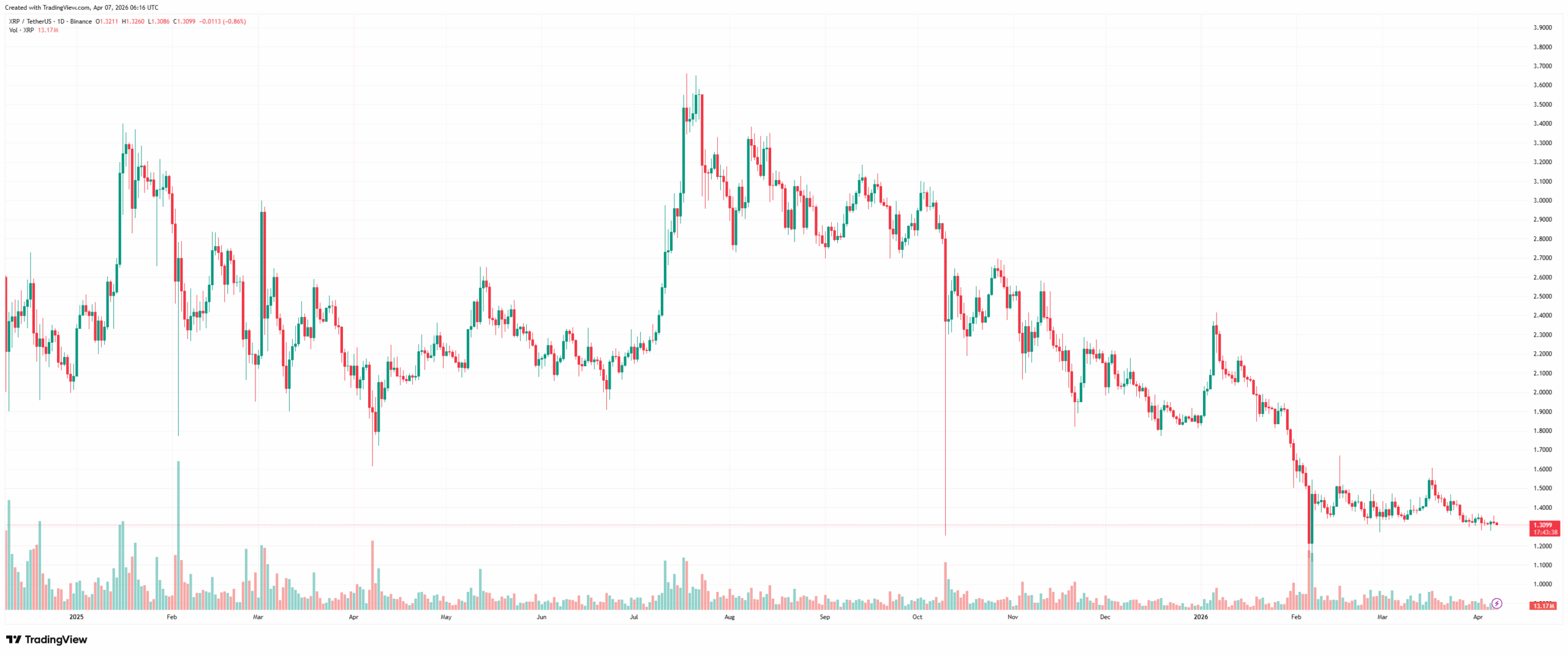 انخفض سعر XRP إلى حوالي 1.31 دولار في 7 أبريل، بانخفاض قدره 2.5% على مدار الـ24 ساعة الماضية. وهذا يرفع خسائره الإجمالية على مدار الأسبوعين الماضيين إلى 7.3% وقرابة 30% على مدار العام الماضي.