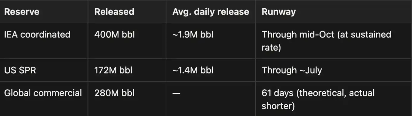 এই সংখ্যাগুলি নিজেদের মধ্যেও সমস্যা রয়েছে: কৌশলগত তেল সঞ্চয় (SPR) এর মুক্তির ভৌত সীমাবদ্ধতা রয়েছে, যা ঐতিহাসিকভাবে প্রায় 2 মিলিয়ন ব্যারেল/দিন। অর্থাৎ, বাস্তবিকভাবে ফাঁকটি পূরণ করার ক্ষমতা, কাগজের উপরের headline সংখ্যার চেয়ে অনেক কম।