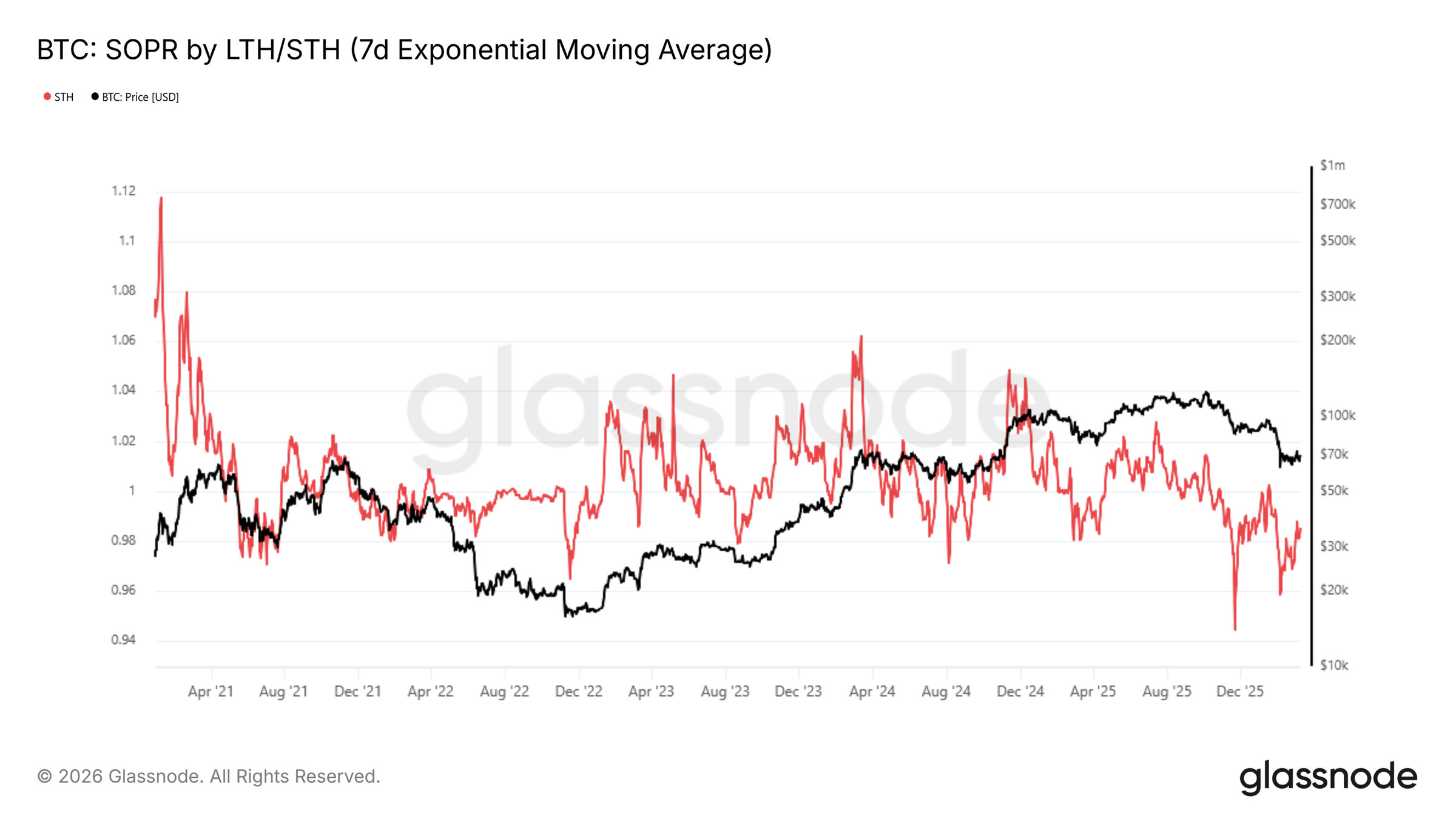 SOPR (Spent Output Profit Ratio) সাধারণত চেইনের উপর মুভিং কোইনের গড় লাভ-ক্ষতি অনুপাত পরিমাপ করে, যেখানে LTH-SOPR 155 দিনের বেশি ধরে রাখা দীর্ঘমেয়াদী হোল্ডারদের উপর ফোকাস করে। LTH-SOPR 1-এর নিচে নামলে এটি প্রায়শই পুরনো কোইনগুলির স্টপ-লস বিক্রয় শুরু হওয়ার ইঙ্গিত দেয়, যা ঐতিহাসিকভাবে গভীর বিষম বাজারের তলদেশের সাথে মিলে যায়।