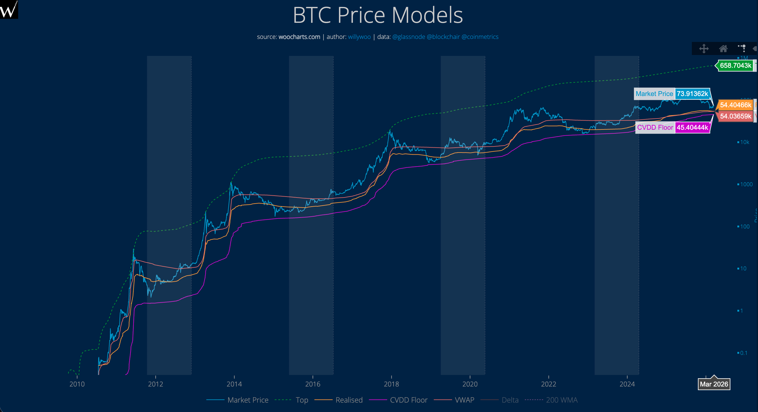 উল্লেখযোগ্য যে, এই বক্ররেখা ২০১৮ সালের ডিসেম্বর এবং ২০২২ সালের নভেম্বরে দুইবার BTC বাজার মূল্যের কাছাকাছি গিয়েছিল, তবে এখনও এই বক্ররেখার নিচে কখনও নেমে আসেনি।