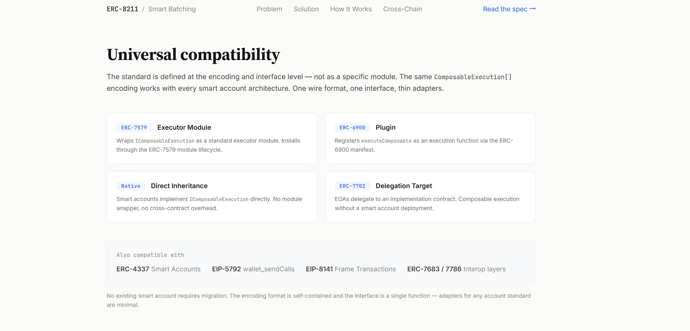 উল্লেখযোগ্য যে, ERC-8211 এর সাথে ERC-4337, EIP-7702, ERC-7579 ইত্যাদি অ্যাকাউন্ট অ্যাবস্ট্রাকশন ফ্রেমওয়ার্ক সম্পূর্ণরূপে সামঞ্জস্যপূর্ণ, এটি অ্যাকাউন্ট অ্যাবস্ট্রাকশনকে প্রতিস্থাপন করে না, বরং অ্যাকাউন্ট অ্যাবস্ট্রাকশনের উপরে এজেন্টের জন্য একটি প্রোগ্রামেটিক একিউটিভ সিম্যান্টিক্সের স্তর যোগ করে।