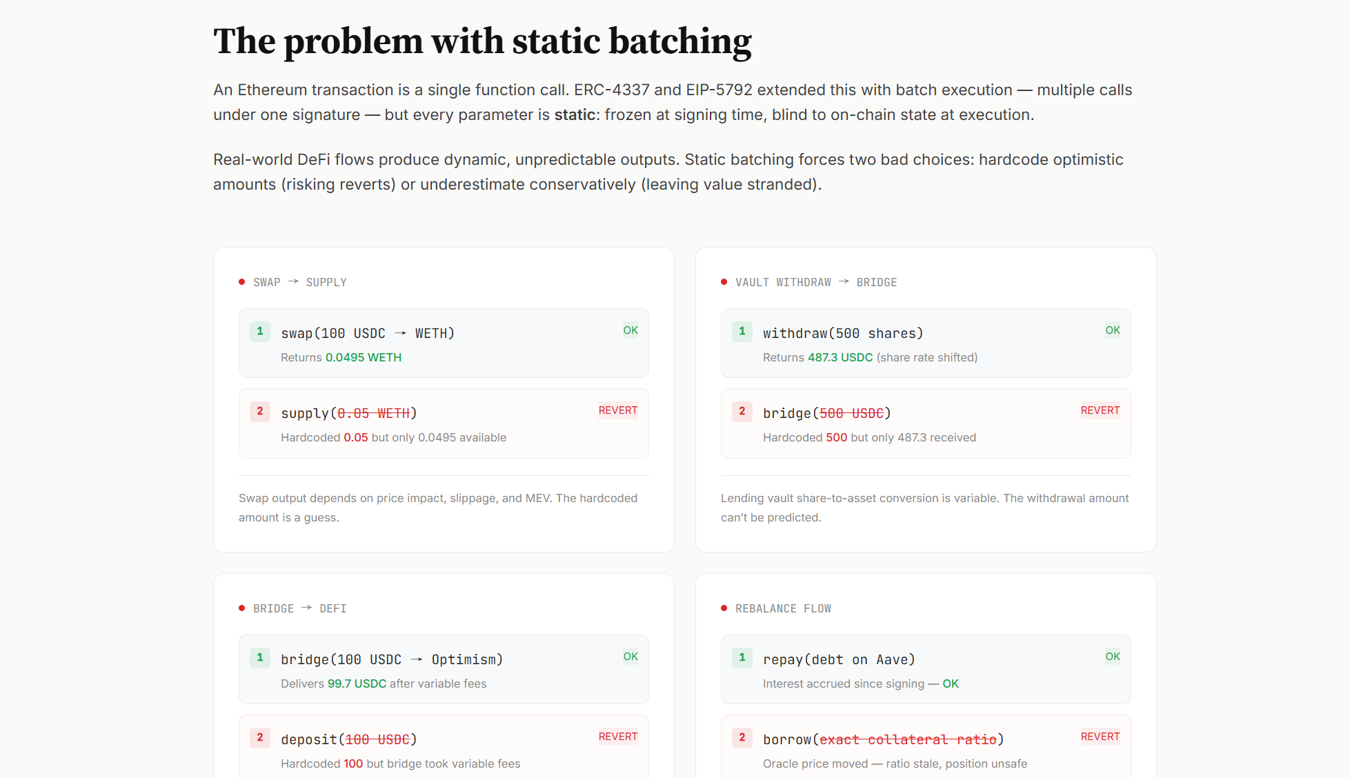 বর্তমান স্ট্যাটিক ব্যাচ প্রসেসিং মডেলের অধীনে, এজেন্টকে স্বাক্ষরের আগে সোয়াপের পর কতটা USDC পাবে তা অনুমান করতে হয়, যা প্রায়শই স্বাক্ষরের সময় দ্বিতীয় ধাপের ইনপুট পরিমাণকে পূর্বনির্ধারিতভাবে সেট করতে বাধ্য করে, এবং এটি খুব বেশি হলে বাস্তবে প্রাপ্ত পরিমাণ যথেষ্ট না হওয়ায় সমগ্র ব্যাচ রোলব্যাক হয়; আবার এটি খুব কম হলে, টাকা ওয়ালেটের মধ্যে অকার্যকরভাবে বিশ্রাম নেয়।