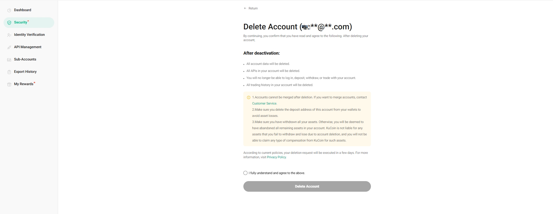 5. Once you’ve read and understood the KuCoin account deletion terms and conditions, select “I fully understand and accept the consequences” and select the “Delete Account” button.
