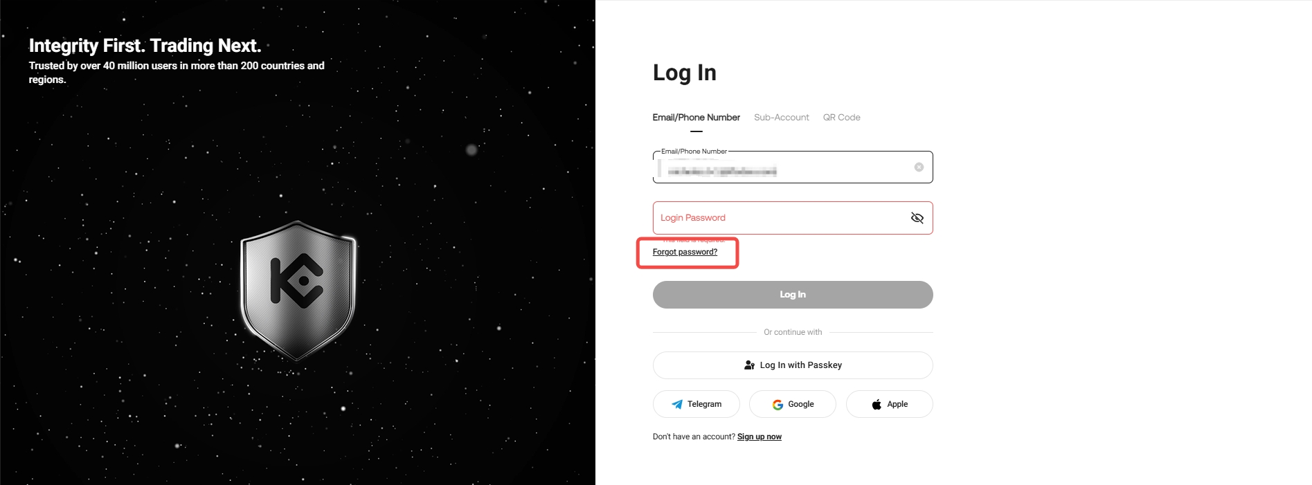 Step 1:  Go to the KuCoin Login page and enter your registered Email address or phone number