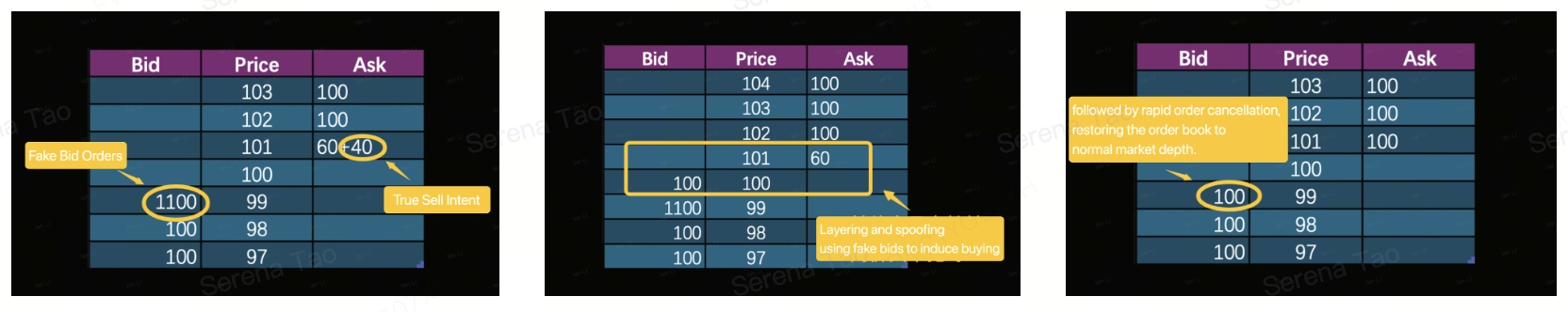 Por ejemplo, Sarao normalmente reporta sus órdenes falsas en una posición de 3-4 niveles alejada de la oferta óptima, y modifica continuamente la oferta a través del programa para mantenerla en este nivel. Esta técnica de fijación de precios no solo permite que otros inversores vean los precios de estas órdenes, generando mayor presión en el mercado, sino que también mantiene estas ofertas a una distancia segura del precio óptimo, evitando eficazmente las transacciones.