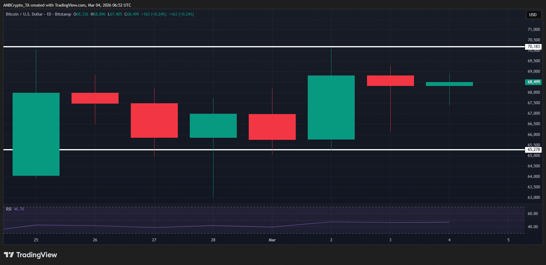 - Con BTC sosteniendo la zona de $67k a pesar de la fuerte oferta subacuática, la acción de precio sugiere absorción por manos más fuertes, no distribución.