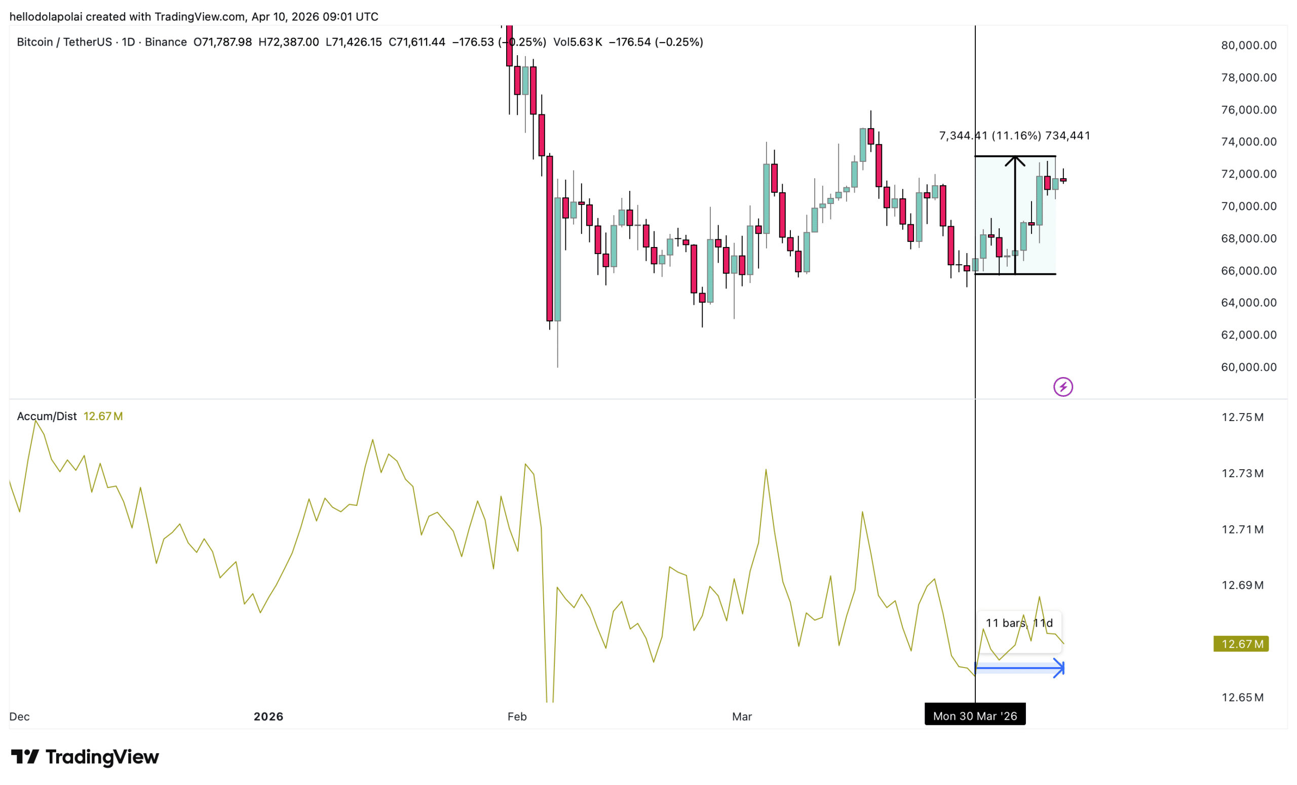 - Bitcoin ha registrado 11 días consecutivos de acumulación mientras el activo opera dentro de una zona de descuento.