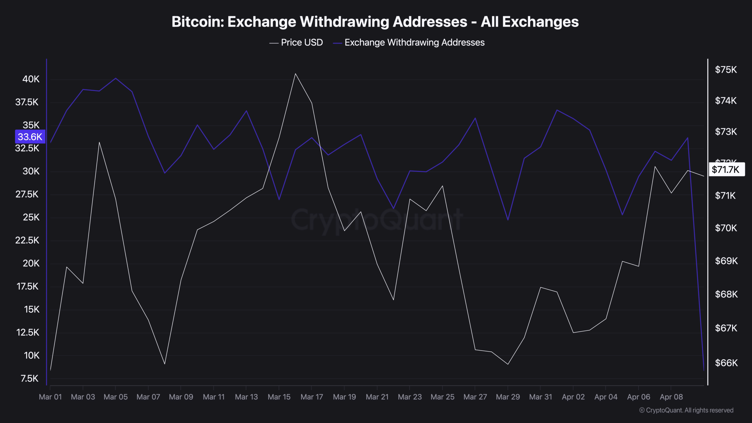 Entre el 5 y el 9 de abril, un total de 8.371 direcciones de bitcoin retiraron sus tenencias de exchanges. Este movimiento subraya la creciente convicción de los inversores posicionándose para un alza a plazo más largo.