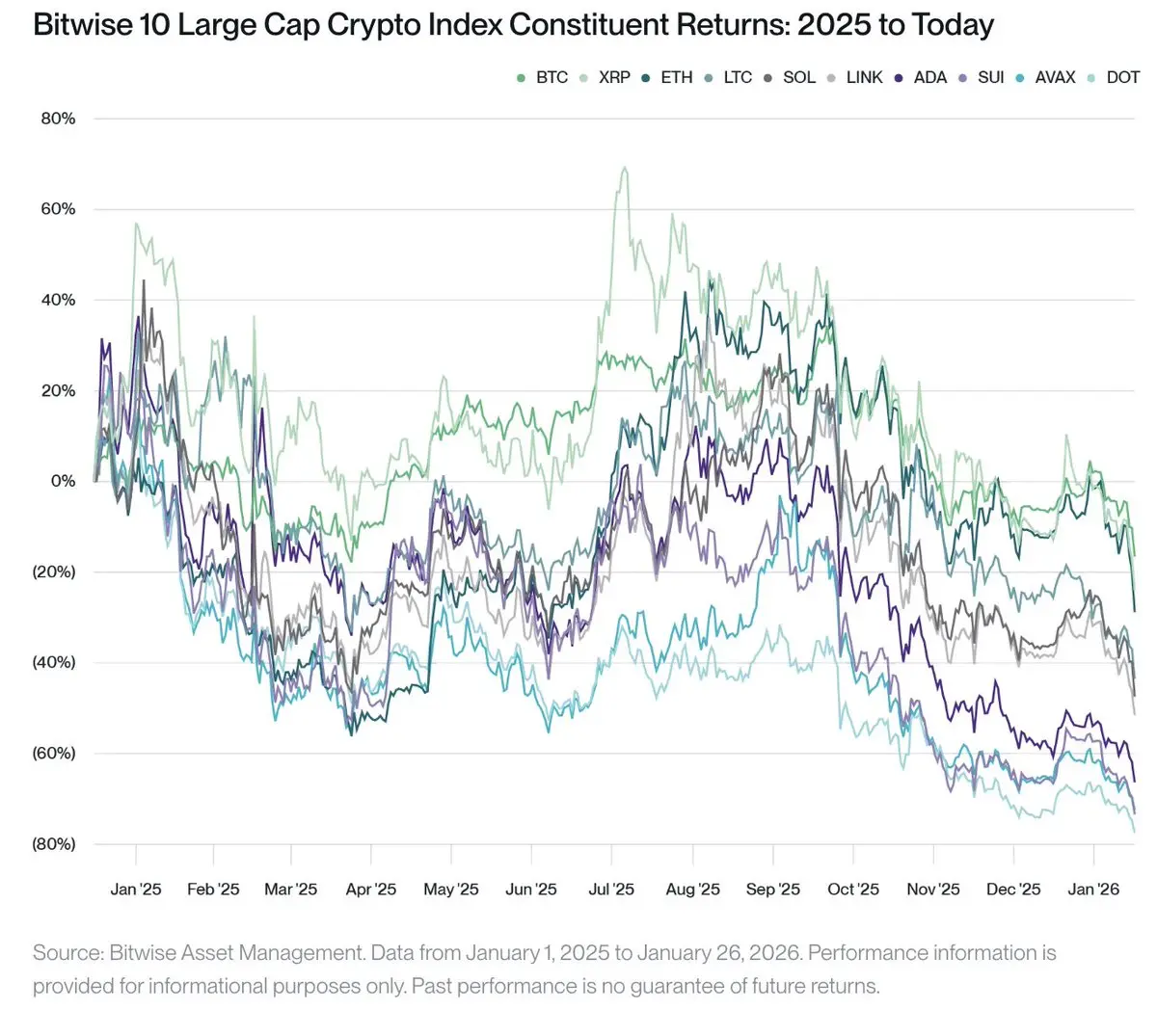 Se divide claramente en tres grupos. Los activos del primer grupo (BTC, ETH, XRP) tuvieron un desempeño relativamente bueno, cayendo entre un 10,3 % y un 19,9 %. Los activos del segundo grupo (SOL, LTC, LINK) experimentaron una caída típica de mercado bajista, con descensos entre un 36,9 % y un 46,2 %. Pero los activos del tercer grupo (ADA, AVAX, SUI, DOT) sufrieron un fuerte impacto, cayendo entre un 61,9 % y un 74,7 %.