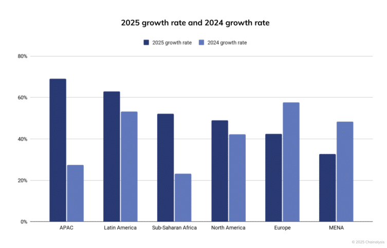 Según Chainalysis, la actividad de cripto en la región APAC más amplia aumentó casi un 70% en 2025, de $1,4 billones a $2,4 billones, marcando la tasa de adopción anual más alta. América Latina y África se ubicaron entre las tres regiones con las tasas de adopción de cripto más altas.