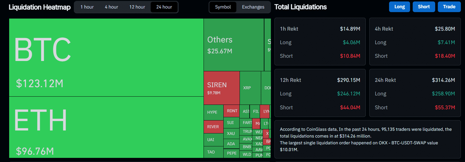 De hecho, esta expansión pronunciada del rango señala una revalorización rápida en lugar de una demanda estable. Al mismo tiempo, liquidaciones aumentaron a más de $300 millones, un 80% más, con más de $123 millones provenientes de BTC, lo que indica que los deshacimientos forzados dominaron la acción de precios.