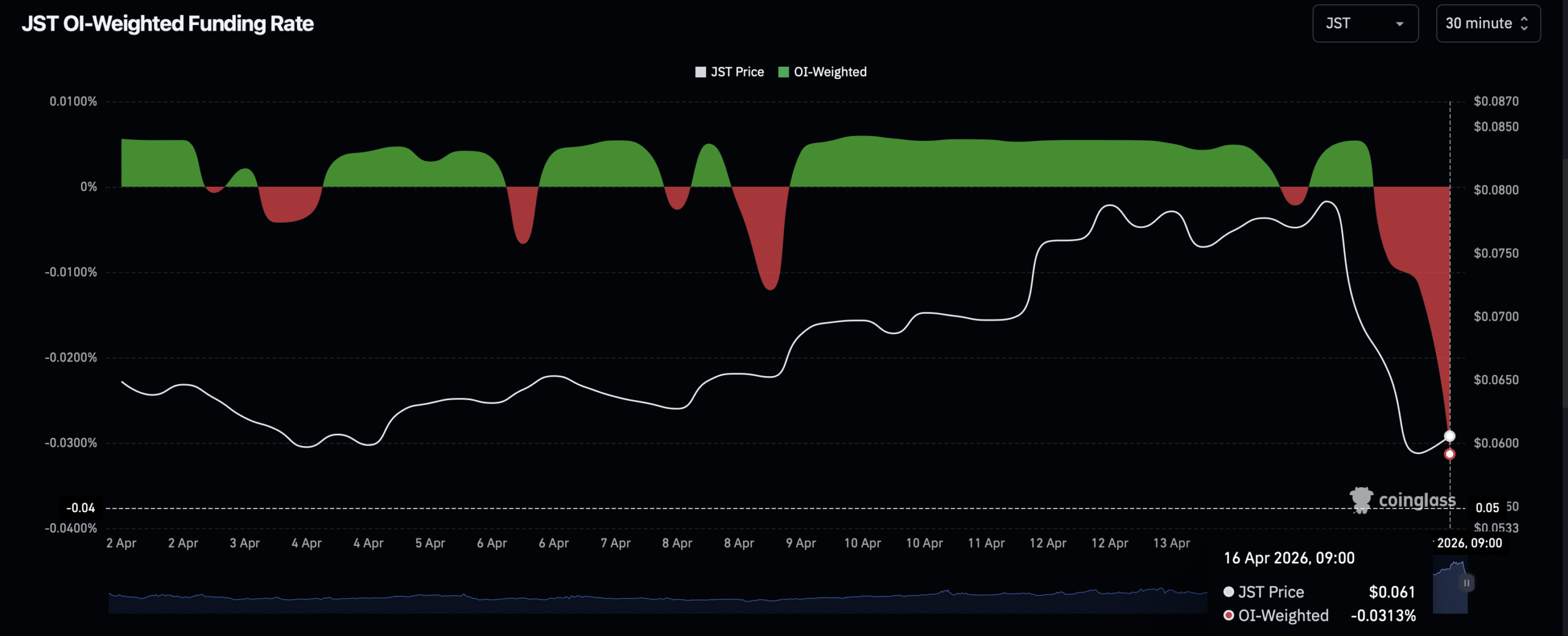 La debilidad de JST parece estar cada vez más impulsada por el mercado de futuros perpetuos, donde las posiciones siguen estando fuertemente sesgadas a la baja.