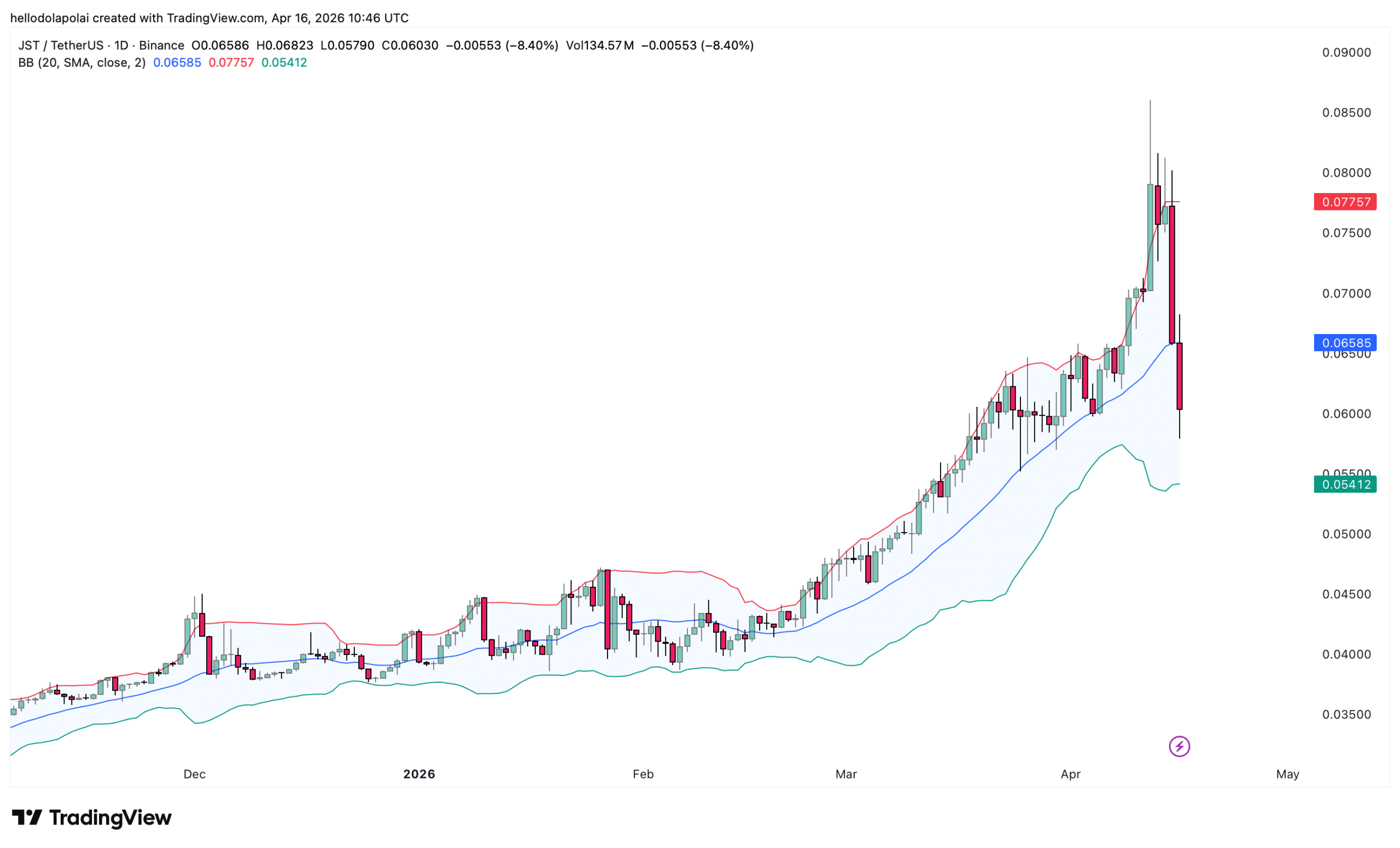 En las últimas 24 horas, JST ha disminuido aproximadamente un 25%, divergiendo marcadamente del mercado de criptomonedas en general, que ha ganado más de $30 mil millones en valor en los últimos seis días. El contexto macroeconómico normalmente apoyaría un impulso alcista, pero JST ha seguido tendiendo a la baja.