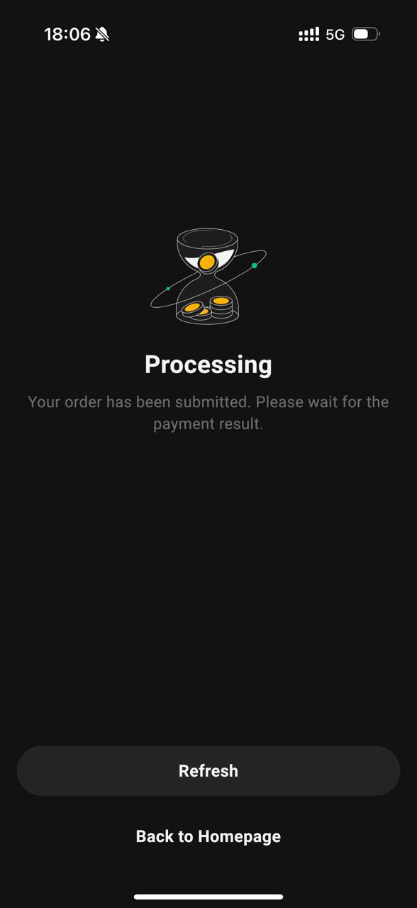 Si el proceso tarda demasiado, la oferta puede expirar. En este caso, serás redirigido a una nueva página de oferta. Por favor, revisa la oferta actualizada y confirma la transacción nuevamente para continuar.