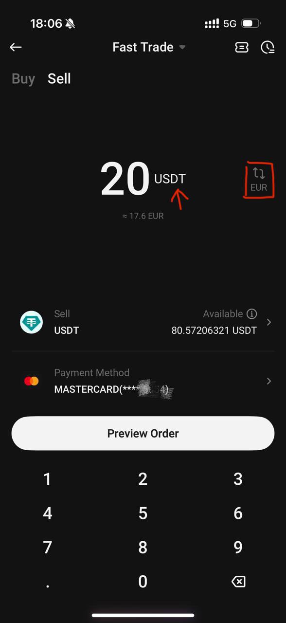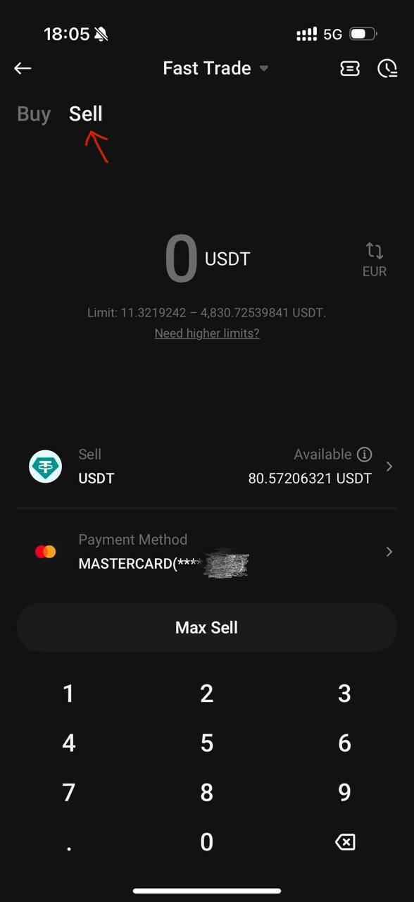 Inicia sesión en tu aplicación KuCoin y ve a [Comprar Cripto] - [Operar Rápido], luego cambia a [Vender] en la parte superior.