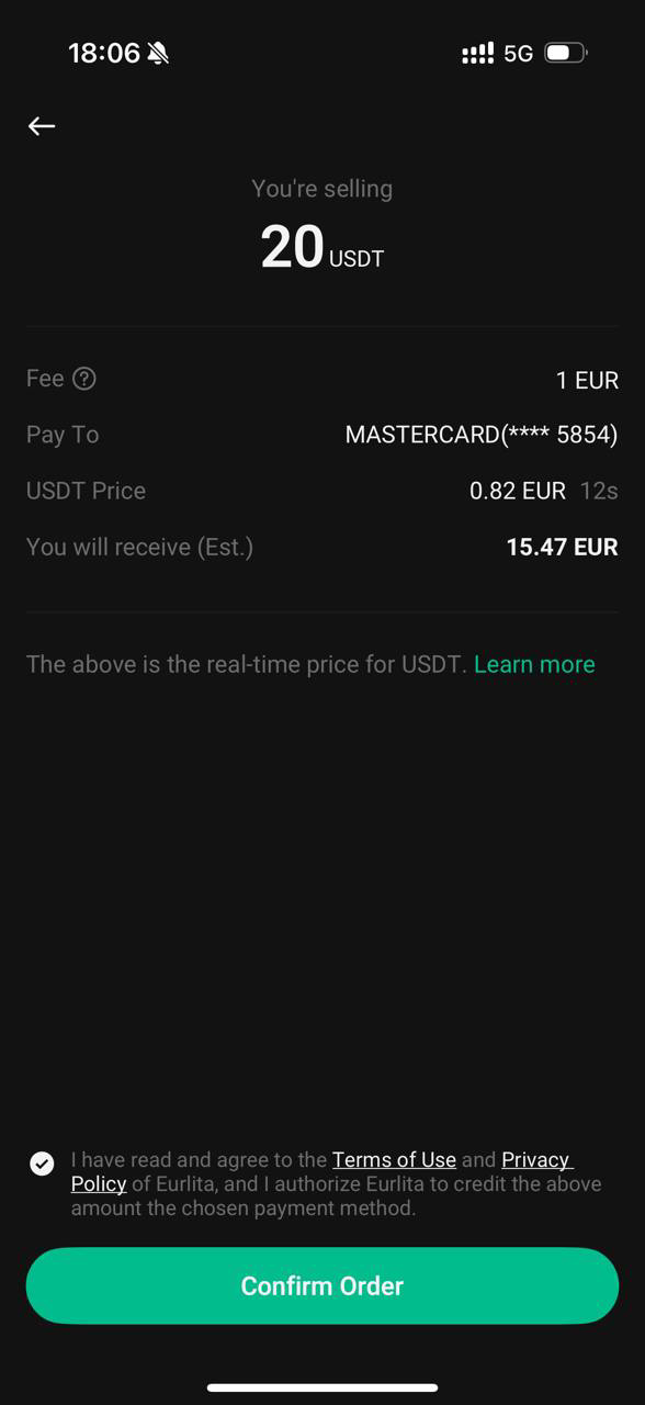 Elige la criptomoneda que deseas vender, selecciona la moneda que deseas recibir, ingresa la cantidad y elige [Tarjeta] como método de pago. Lee y acepta los Términos de Servicios de Compra y Venta.