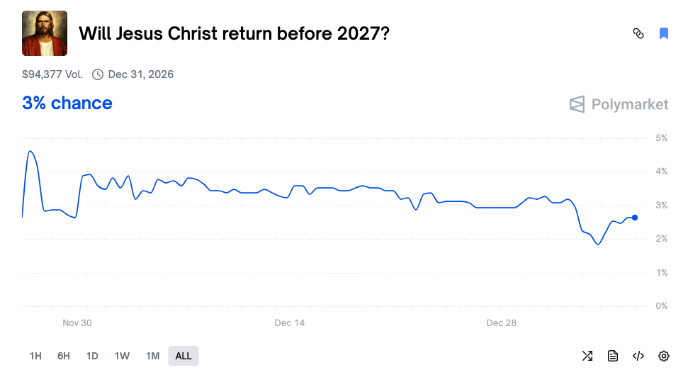 Ang kontrata sa merkado ng pangyayari sa Polymarket kung uuibig muli ang Jesus sa 2025 ay nakalikha ng humigit-kumulang $3.3 milyon na pondo bago ang pagsesettlement nito noong Disyembre 31, 2025, at ang posibilidad ng kanyang pagbabalik ay nanatiling higit sa 3% nang mahaba. Dahil ang pangyayari ay naging "hindi" sa huling pagpapasya, ang mga nag-imbento ng "hindi" noong Abril ay nakamit ang humigit-kumulang 5.5% na taunang rate ng pagbalik, na mas mahusay kaysa sa yield ng U.S. Treasury (humigit-kumulang 4.1% para sa 10-taon na takdang wakas ng 2025).