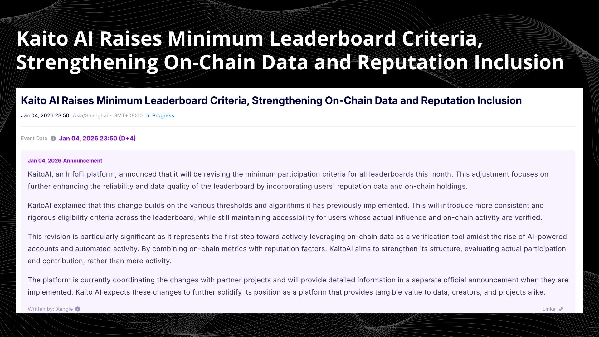Ang pinakaikologal na galaw ay nangyari noong Enero 4, 2026, nang opisyaly ni Kaito na anunsiyohan ang pag-upgrade ng lahat ng mga pamantayan para sa pagsali sa mga paligsahan. Ang update na ito ay nagbago ng logic ng timbang ng impluwensya mula sa base nito sa pamamagitan ng pag-introdusir ng data ng reputasyon at mga holdings sa blockchain. Ito ay nangangahulugan na sa ekosistema ng Kaito, ang "pangit na kaguluhan" na nangyayari lamang dahil sa paggamit ng mga AI script at awtomatikong pag-post ay wala nang puwang. Ang sistema ay nagsisimulang pilit na alisin ang mga aktibidad na may mababang kalidad sa pamamagitan ng pagsasama ng mga sukatan ng blockchain at timbang ng reputasyon sa social media, at siguraduhin na ang bawat impluwensya ay may tunay na pondo bilang suporta. Ang Kaito ay pumapalit mula sa pagmamapa kung "sino ang nagsasalita" patungo sa pagmamapa kung "sino ang may kwalipikasyon na makinig nang maayos."