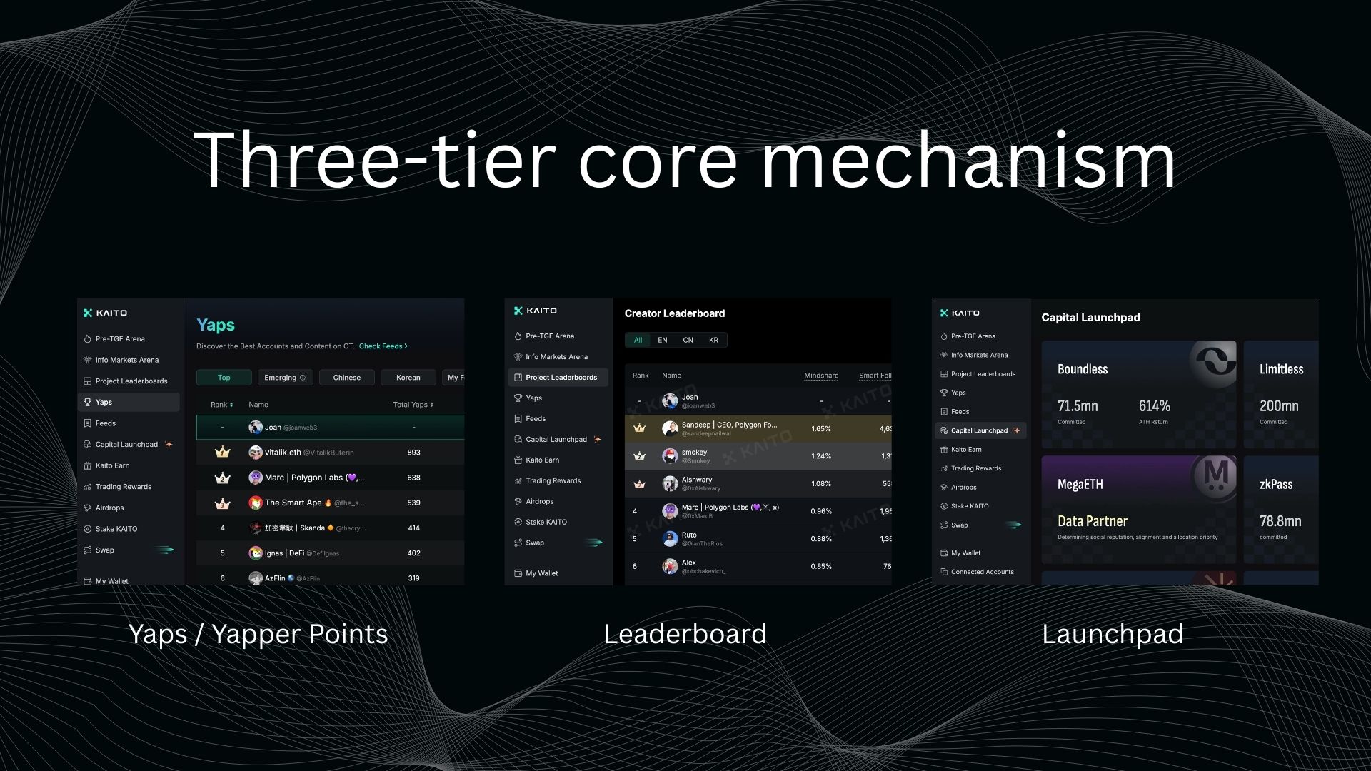 Sa huli,Nagawa ni Kaito ng pagpapalakas sa sariling paglago sa pamamagitan ng Yapper Launchpad at Capital LaunchpadAng pangunahing lohika nito ay simple lamang:Ang mga taong nagsasalita para sa proyekto ay dapat magkaroon ng tunay na kapangyarihan sa pamamahagi ng mga mapagkukunanAng mga ambag ng nilalaman ay inilipat sa pamamagitan ng Leaderboard bilang mga quota at airdrop, na sa wakas ay nasa token at karapatan sa paggalang, kaya ang pansin ay naging tunay na benepisyo at nagawa nitong maging mga aktwal na stakeholder ang mga user na may mataas na kalidad.