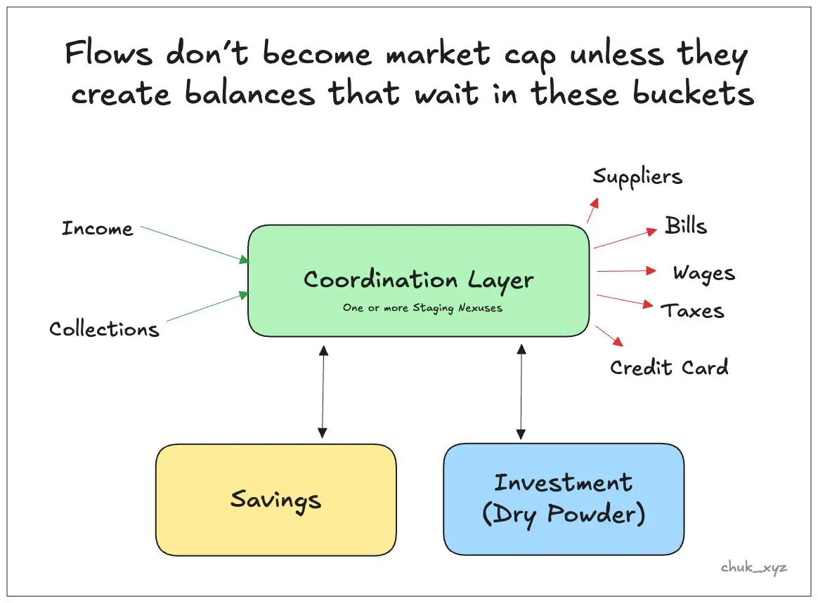 Ang unaan level ng balanse ayCoordinate (Turnover) LayerIto ay binubuo ng mga temporaryal na node kung saan ang pera ay "natatanggap" at "binabayaran"sa pagitan ngAng lugar kung saan nananatili at naghihintay ang pera bago magawa ang susunod na aksyon. Para sa mga retail na gumagamit, ito ay ang kanilang checking account o wallet; para sa mga kumpanya, ito ay ang cash na dapat handa para sa mga bayarin sa suweldo, supplier, at buwis; para sa mga institusyon, ito ay ang operasyonal na likididad na nauugnay sa capital market: ang pre-paid balances at inventory. Ang mga holding node ay hindi laging isang bank account (ang float sa M-Pesa sa Kenya ay nagpapakita na kahit walang kita, maaari pa ring magkaroon ng malaking balanse ang isang wallet).