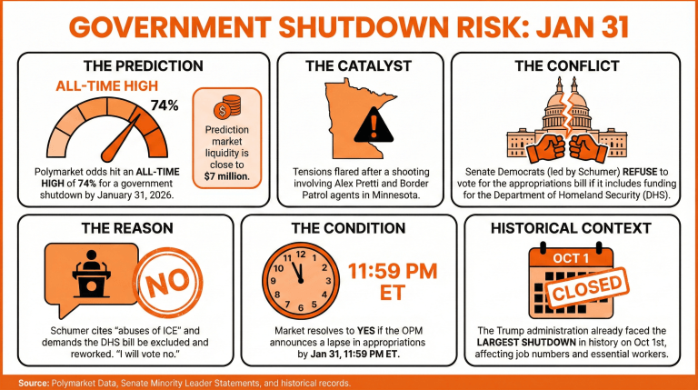 Ano ang mga kasalukuyang posibilidad ng isang pagbagsak ng gobyerno sa U.S.? Mga posibilidad ng Polymarket ay nagpapahiwatag ng isang 74% chance ng isang pagbagsak ng gobyerno noong Enero 31, 2026, matapos ang mga nangyari kamakailan tungkol sa mga opisyales ng Border Patrol.