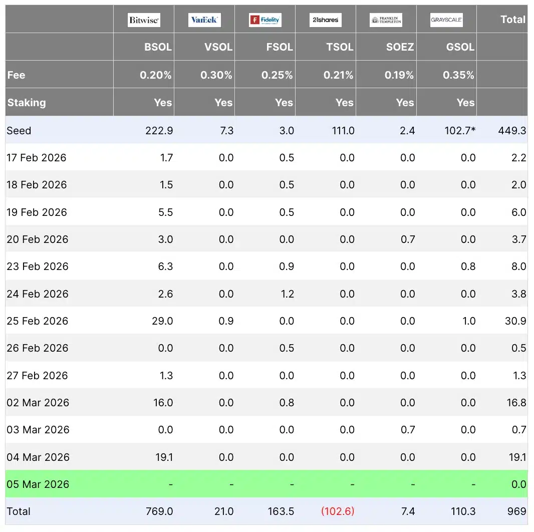 En revanche, Solana [SOL] affichait une tendance différente. Même pendant la récente faiblesse du marché, les ETF SOL ont continué d'enregistrer des entrées, attirant 19,1 millions de dollars le 4 mars.