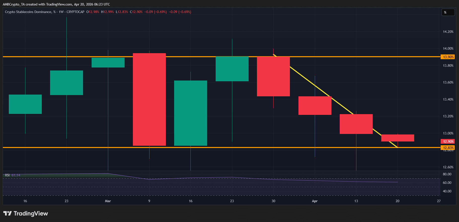 Mais avec un bond de 4,35 % du bitcoin sur la même période, la liquidité semble se réorienter vers le BTC plutôt que de rester immobilisée. Parallèlement, la domination des stablecoins a diminué de plus de 1 %, affichant quatre bougies rouges consécutives et reculant aux niveaux du début mars, tandis que la domination du BTC a augmenté de plus de 1 % sur la même période.