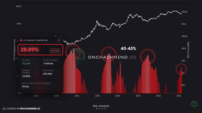 Du point de vue d’un détenteur à long terme, seuls 28,89 % sont actuellement en pertes non réalisées, un scénario qui a historiquement déclenché la panique lorsque ce chiffre atteint la fourchette de 40 à 45 %, marquant le début d’une phase d’accumulation. Sur le plan technique, cela suggère que le BTC pourrait encore avoir de la marge pour une baisse supplémentaire avant un creux. Et avec les FUD macroéconomiques toujours présents, cette structure n’a pas vraiment été invalidée.
