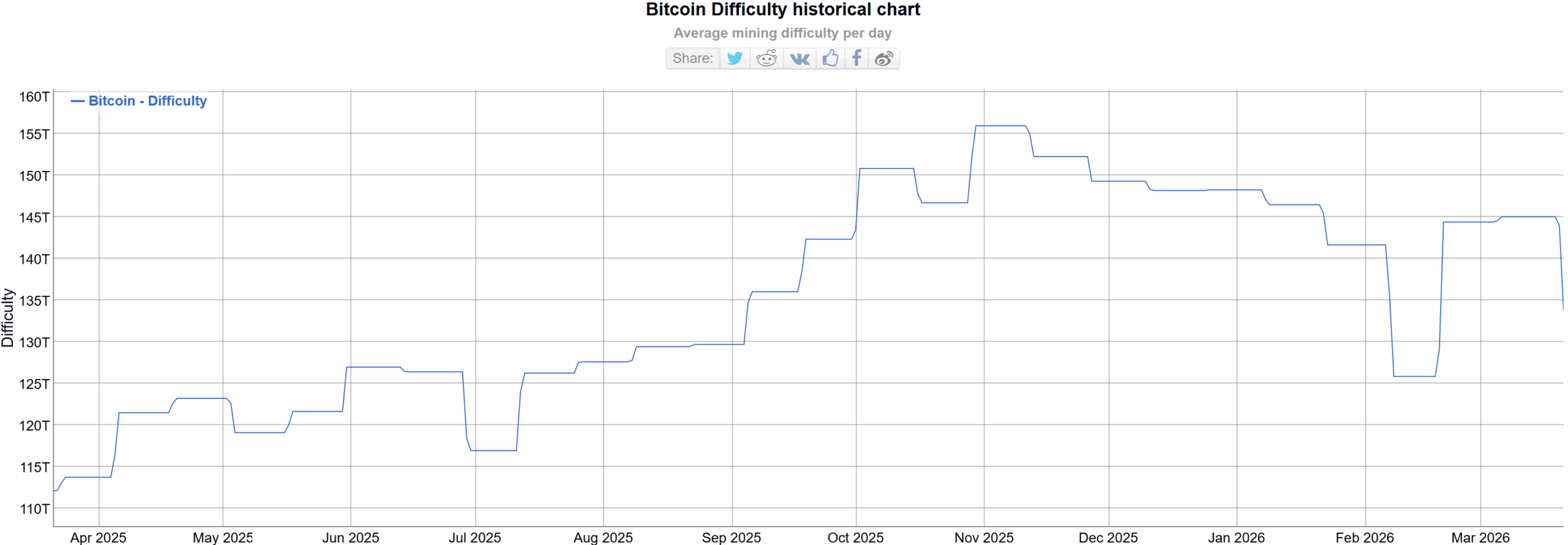 Les données on-chain suggèrent désormais que le prochain ajustement devrait avoir lieu le 3 avril, et les estimations actuelles indiquent que la métrique pourrait augmenter légèrement pour atteindre près de 135T contre 133,79T actuellement. La difficulté a atteint son pic à la fin octobre 2025 à 155T, ce qui signifie que le chiffre actuel est plus de 13 % inférieur.