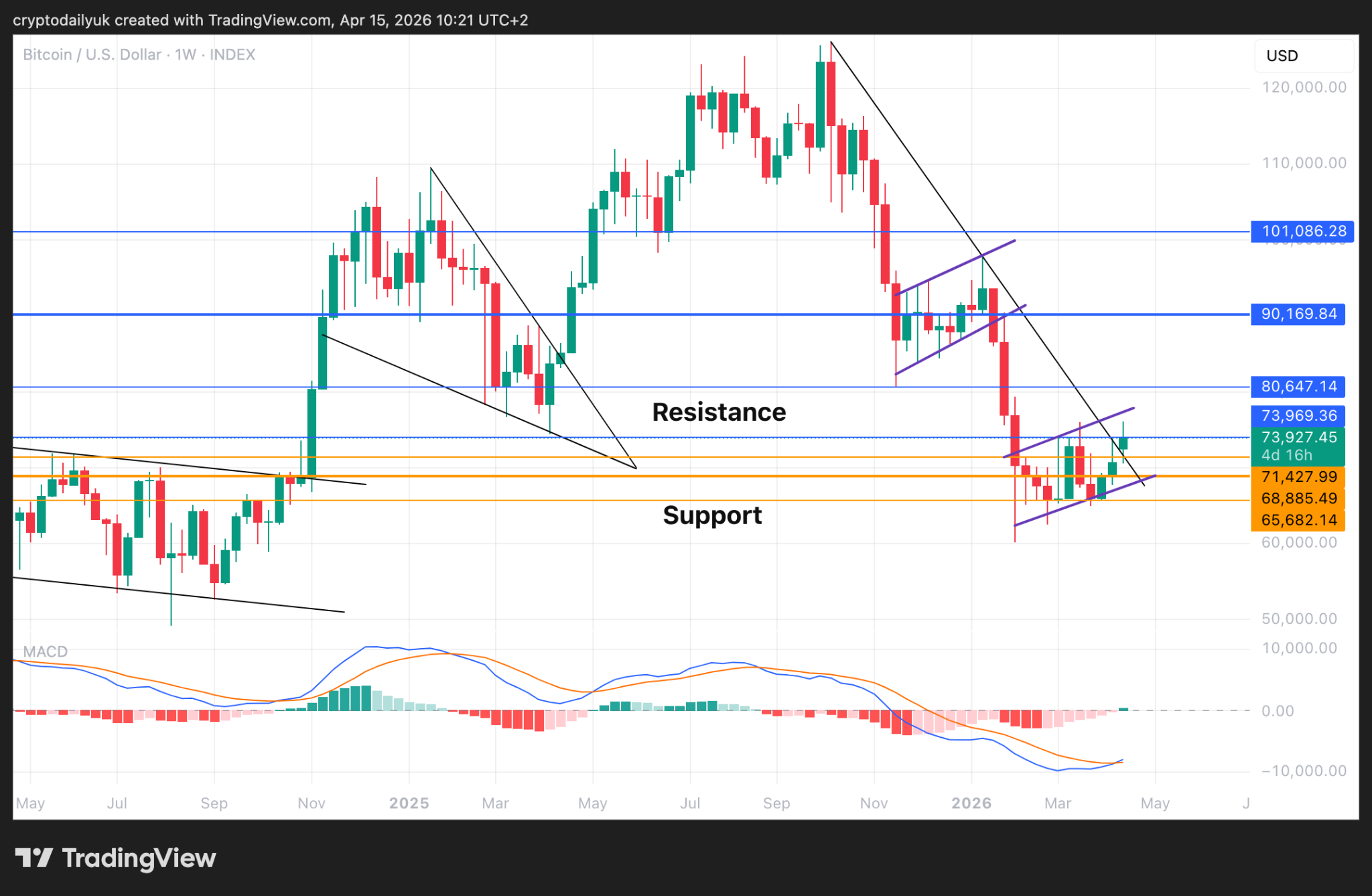 Sur le cadre temporel hebdomadaire, on observe que le niveau horizontal de 74 000 $ constitue une résistance difficile. Une clôture au-dessus de ce niveau à la fin de la semaine serait une grande réussite pour les acheteurs et pourrait ouvrir la voie à 80 000 $.