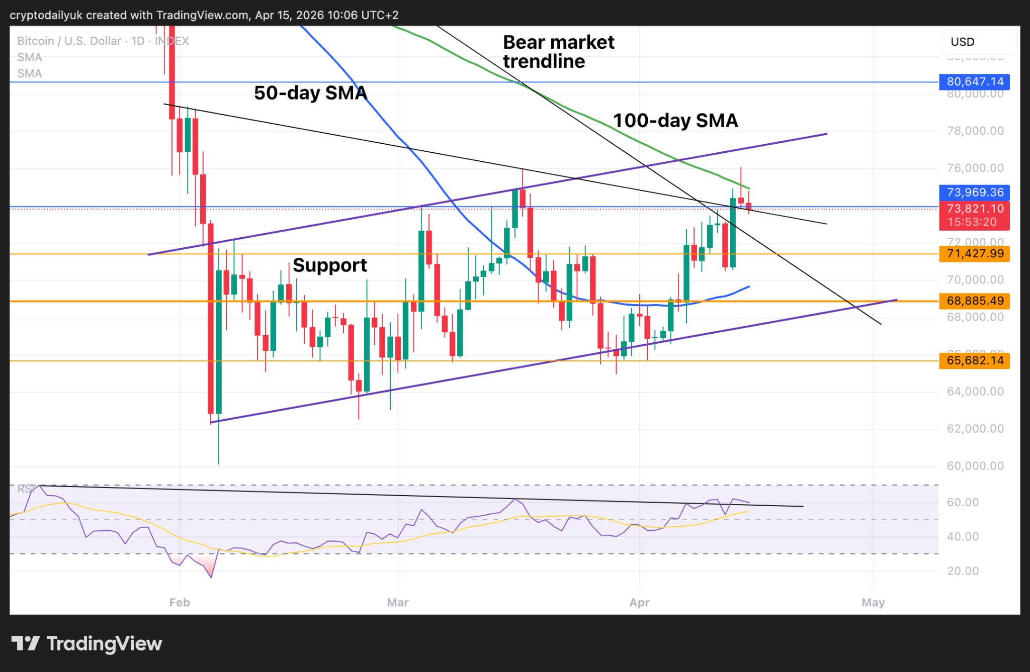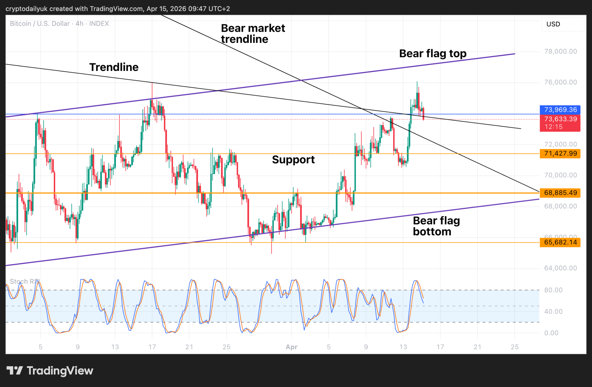 Le cadre horaire de 4 heures montre comment le $BTC price s'est un peu retiré depuis son sommet à 76 000 $. Le recul minimal atteint le niveau actuel du prix, aux alentours du niveau de support/résistance à 74 000 $, ainsi qu'une ligne de tendance descendante.