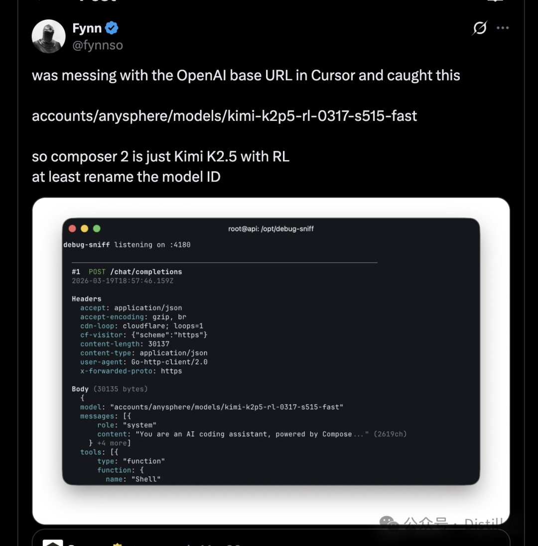 Mais la communauté technique a un nez fin. Le jour de la publication, des développeurs ont remarqué, en appelant l'API de Composer 2, le chemin du modèle retourné : accounts/anysphere/models/kimi-k2p5-rl-0317-s515-fast. Cette chaîne de caractères est presque une présentation d'elle-même — Kimi K2.5, accompagnée d'un fine-tuning RL (apprentissage par renforcement).