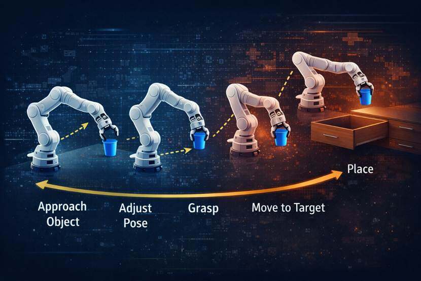 Ce qui manque souvent au système, ce n'est pas la capacité de prédiction locale, mais la capacité à organiser un objectif à long terme en un chemin en étapes. De nombreux gestes semblent, à court terme, s'éloigner de l'objectif, mais sont en réalité des étapes intermédiaires nécessaires à sa réalisation. Par exemple, lever le bras avant de saisir, ou reculer légèrement puis ajuster l'angle avant d'ouvrir un tiroir.