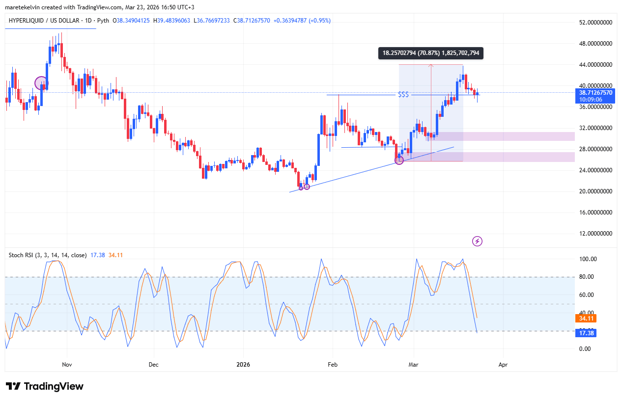 Sur le graphique quotidien, HYPE a négocié près de 20 $ après une courte correction au cours des cinq derniers jours.