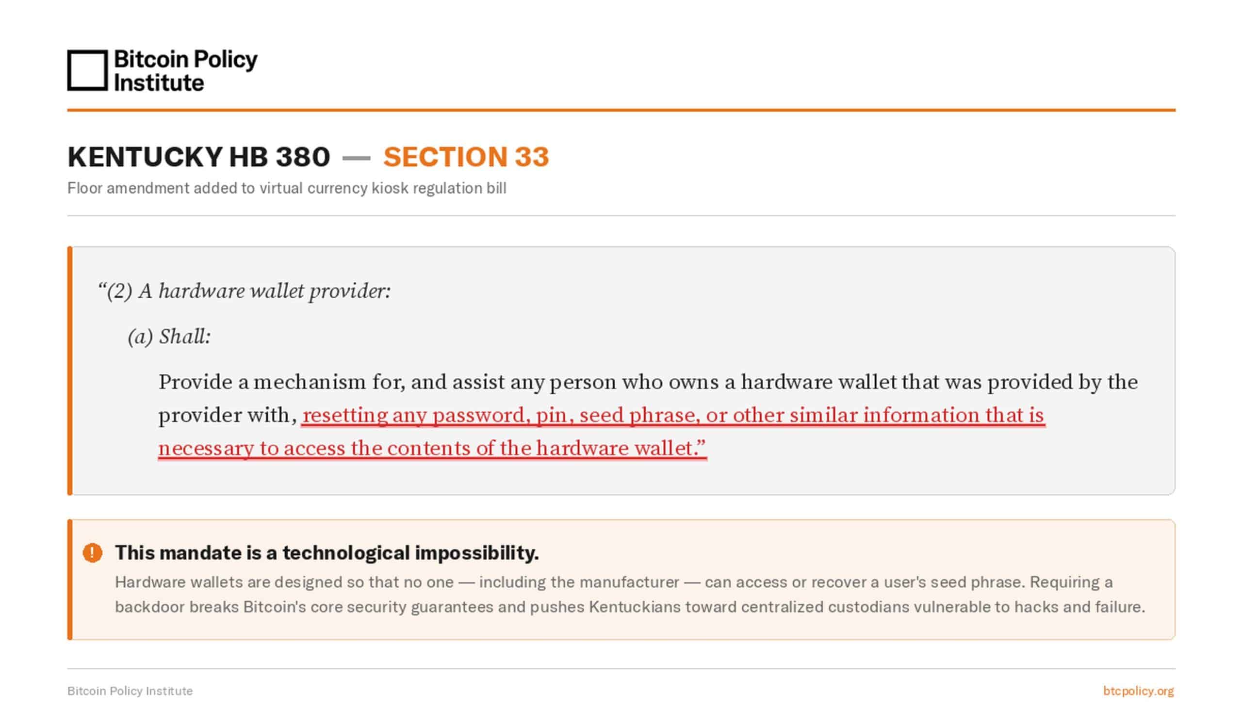 BPI vient d'apprendre une modification cachée dans le Kentucky HB 380 qui exigerait des fournisseurs de wallets matériels de réinitialiser les phrases secrètes des utilisateurs sur demande. Cela interdirait effectivement l'auto-gestion dans le Kentucky.