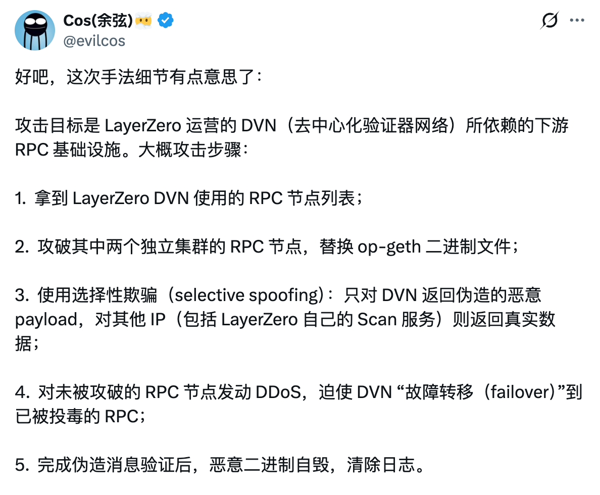 लेयरज़ीरो की ओर से उपलब्ध विवरणों के अनुसार, घटना का सीधा कारण काफी स्पष्ट है: लेयरज़ीरो द्वारा संचालित डिसेंट्रलाइज्ड वेरिफायर नेटवर्क (DVN) पर निर्भर डाउनस्ट्रीम RPC बुनियादी ढांचे को हैक कर लिया गया (देखें नीचे की तस्वीर में मैन्सू के संस्थापक यू का विश्लेषण), और चूंकि Kelp DAO का ब्रिज कॉन्ट्रैक्ट 1/1 DVN का उपयोग करता है, इसलिए हमलावर को केवल एक झूठी संदेश पुष्टि पूरी करने की आवश्यकता है, जिससे हमला पूरा हो जाता है।
