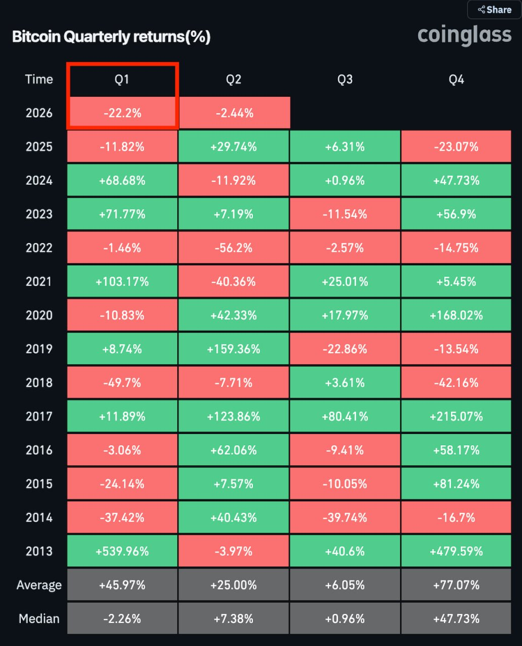 इतिहास के अनुसार, बिटकॉइन की पहली तिमाही की प्रदर्शन अलग-अलग परिणाम देती है, हालांकि 2026 की गिरावट का पैमाना सामान्य सीमा से अधिक है। उदाहरण के लिए, पिछले चक्रों में लाभ हुआ, जिसमें 2023 में +71.77%, 2021 में +103.17%, और 2013 में +539.96% शामिल हैं, जबकि कमजोर वर्षों जैसे 2018 (-49.7%) और 2014 (-37.42%) नीचे की चरम सीमाओं को दर्शाते हैं। फिर भी, माध्यिका Q1 लाभ -2.26% है, जो दर्शाता है कि हालांकि अस्थिरता सामान्य है, लेकिन नवीनतम गिरावट सामान्य माध्यिका स्तरों से काफी गहरी है।