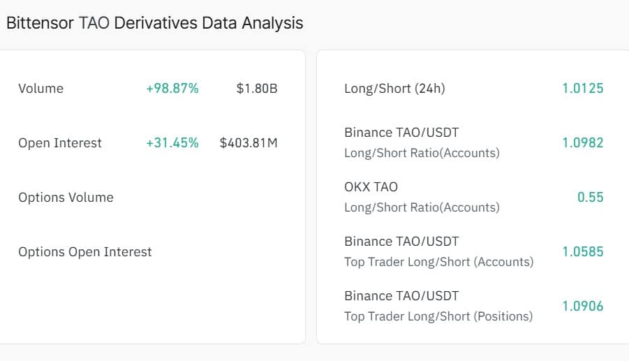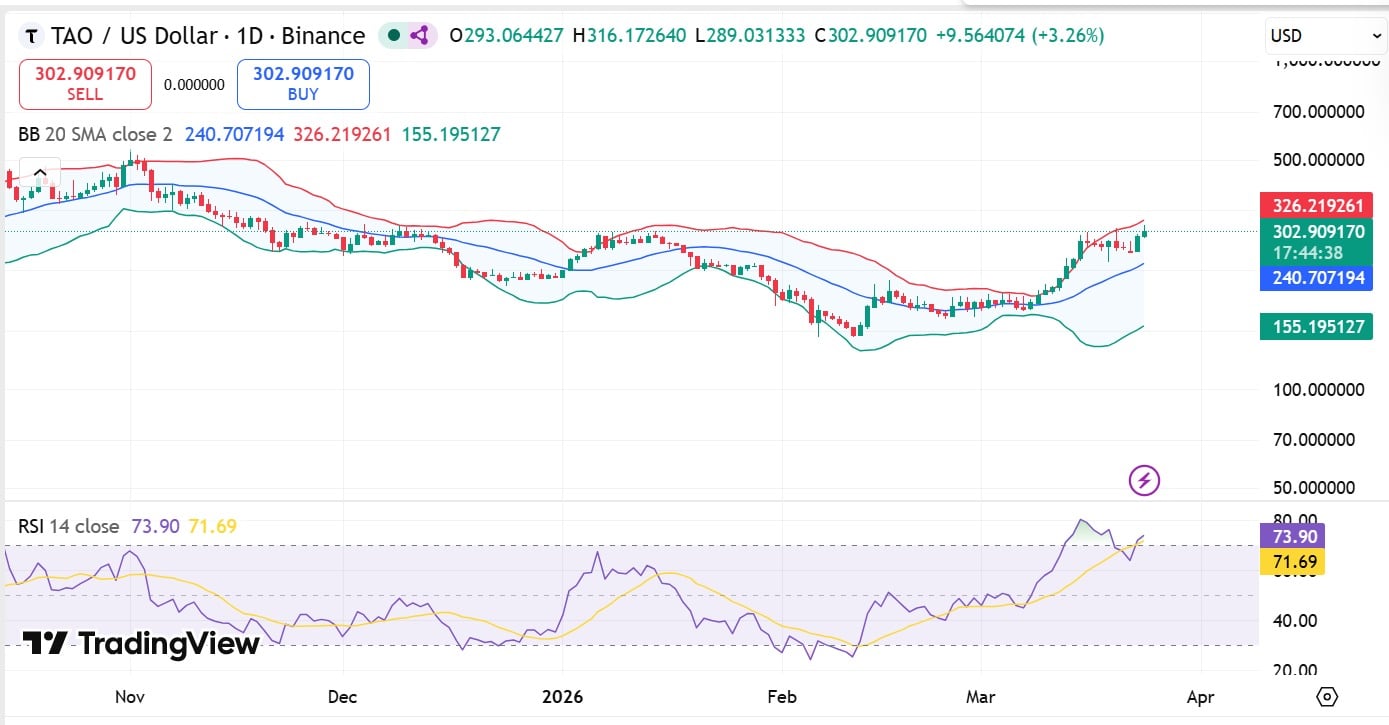 लिखे जाने के समय, TAO का व्यापार $308 पर हुआ, जो दैनिक चार्ट पर 12.15% की वृद्धि है। इसी समय अवधि के दौरान, अल्टकॉइन की ट्रेडिंग मात्रा 122% बढ़कर $655 मिलियन हो गई, जिससे बाजार में भागीदारी में वृद्धि का पता चलता है।