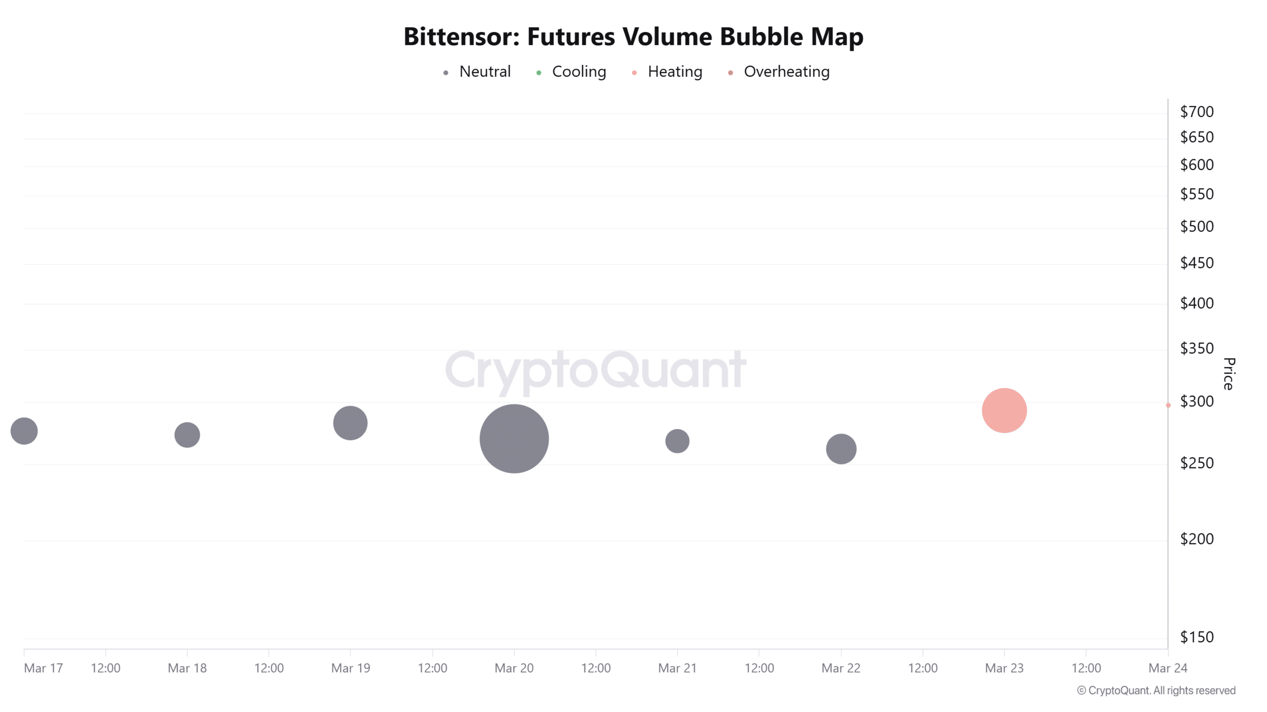 TAO ने महत्वपूर्ण लाभ कमाए, जिसका बड़ा हिस्सा देर से खरीदारों द्वारा रैली में प्रवेश करने के प्रयास से उत्पन्न नए स्पेक्युलेटिव दिलचस्पी के कारण था।फ़्यूचर्स वॉल्यूम बबल मैप ने अत्यधिक बाजार की स्थिति को दर्शाया, जिसमें बहुत सारे ट्रेडर्स ने लेवरेज के साथ पोज़ीशन लेने के कारण FOMO में वृद्धि हुई।