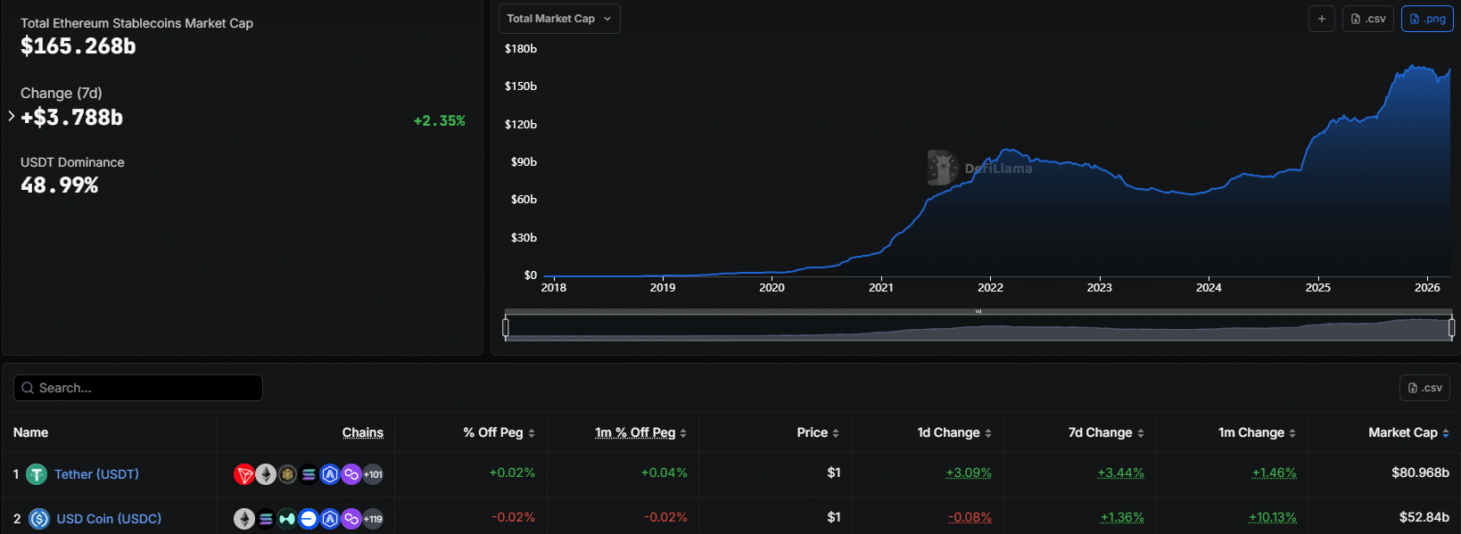ईथेरियम पर USDC के प्रवाह से इसका बाजार हिस्सा 32% से अधिक हो गया है, जबकि USDT 50% से नीचे चला गया है।