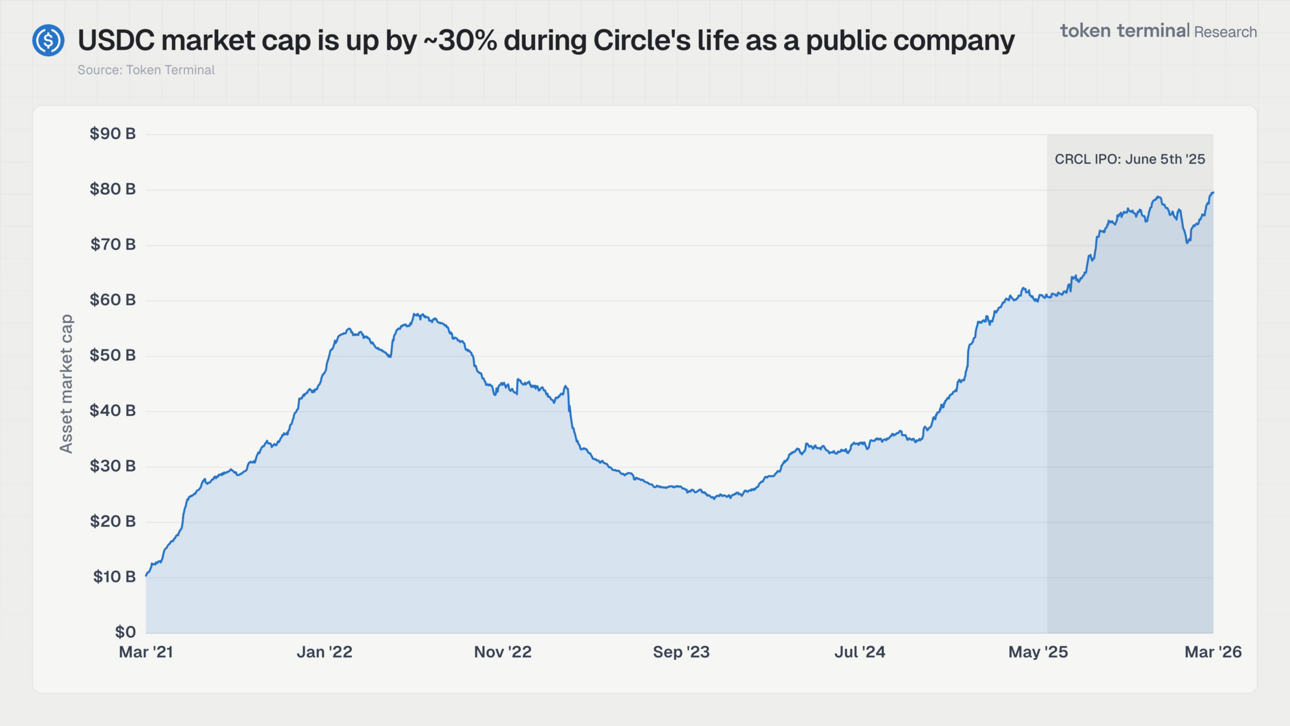 इसके बजाय, यह संदर्भ नींव के डेटा द्वारा मजबूत किया जाता है। USDC की बाजार पूंजीकरण लगभग 30% बढ़ गई है, जिससे $80 अरब को पार करके सर्कल के अंतिम Q2 2025 में IPO के बाद सर्वोच्च स्तर पर पहुंच गई है।