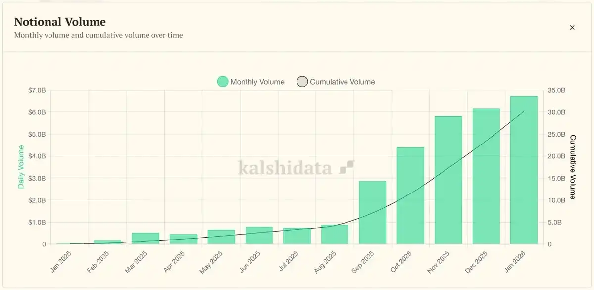 कल्शी डेटा के अनुसार, 29 जनवरी तक, कल्शी की कुल व्यापारिक मात्रा 3.405 अरब डॉलर से अधिक हो गई, जिसमें औसत दैनिक व्यापारिक मात्रा 20.48 मिलियन डॉलर से अधिक है; जबकि इसके काल्पनिक व्यापारिक मात्रा के K-लाइन चार्ट को देखें, तो 2025 के सितंबर से लगभग घातीय वृद्धि हुई है।